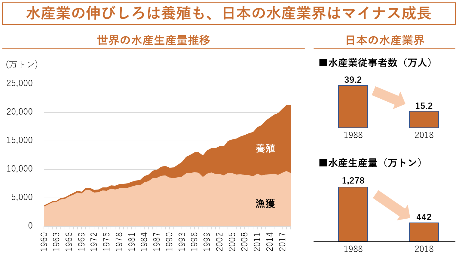 世界の水産生産量は大きく伸びていますが、乱獲・気候変動といった要因によって水産資源の保全が重要となっており、この30年間、漁獲量はほとんど増えていません。つまり水産業界の伸びしろは、天然物の漁獲ではなく、養殖にあります。