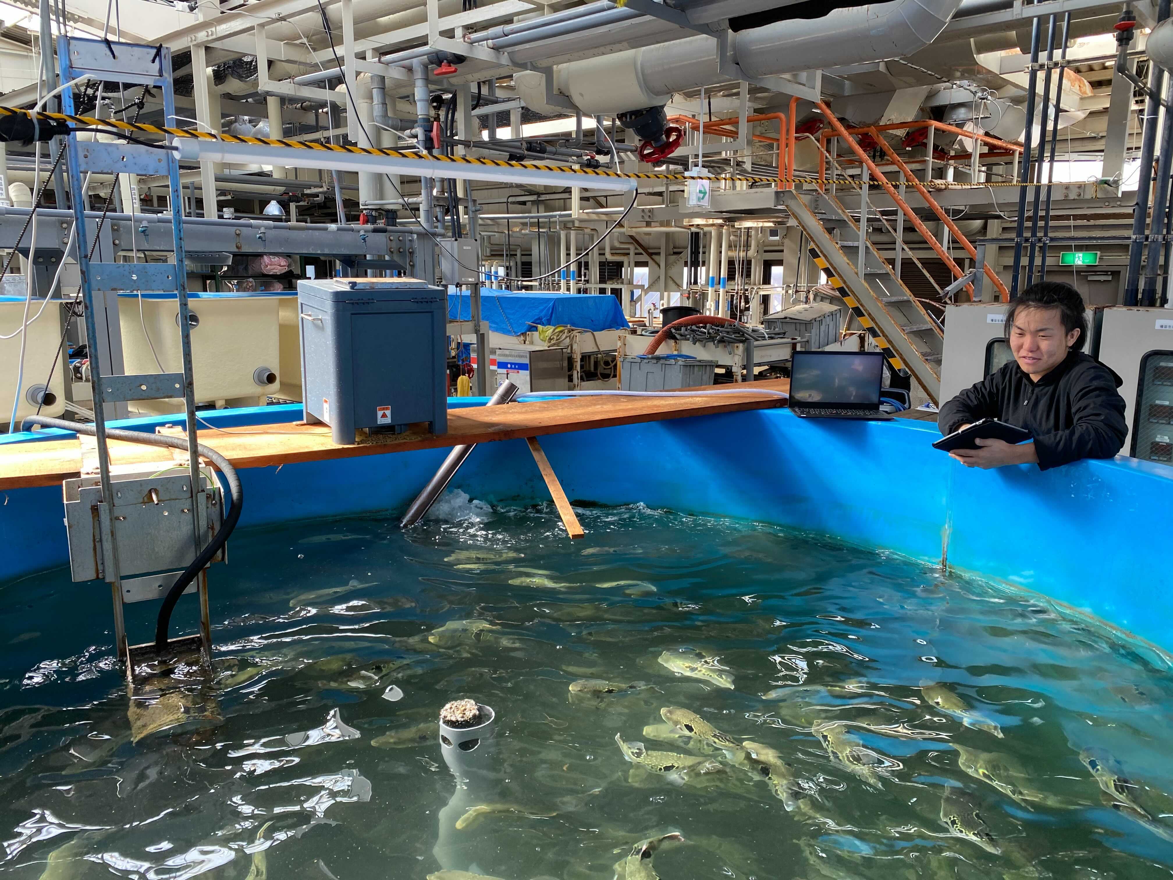 ゲノム編集技術を用いるため、魚が外海に逃げ出さないよう、飼育水槽は陸上養殖施設に設置し、様々な拡散防止措置を執っています。