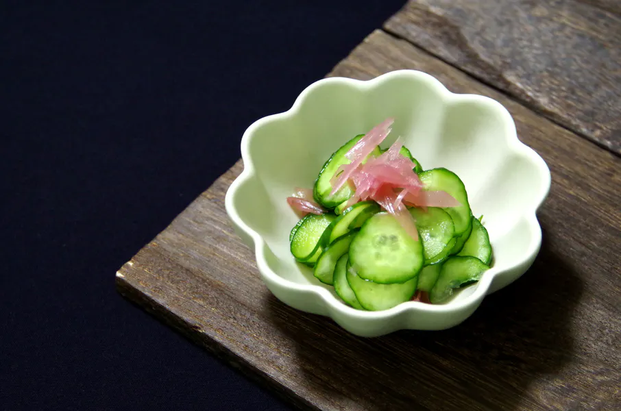 きゅうりの酢の物に、みょうがとみょうがの汁をかけていただくと、味変が出来ます。さっぱりした風味になります。