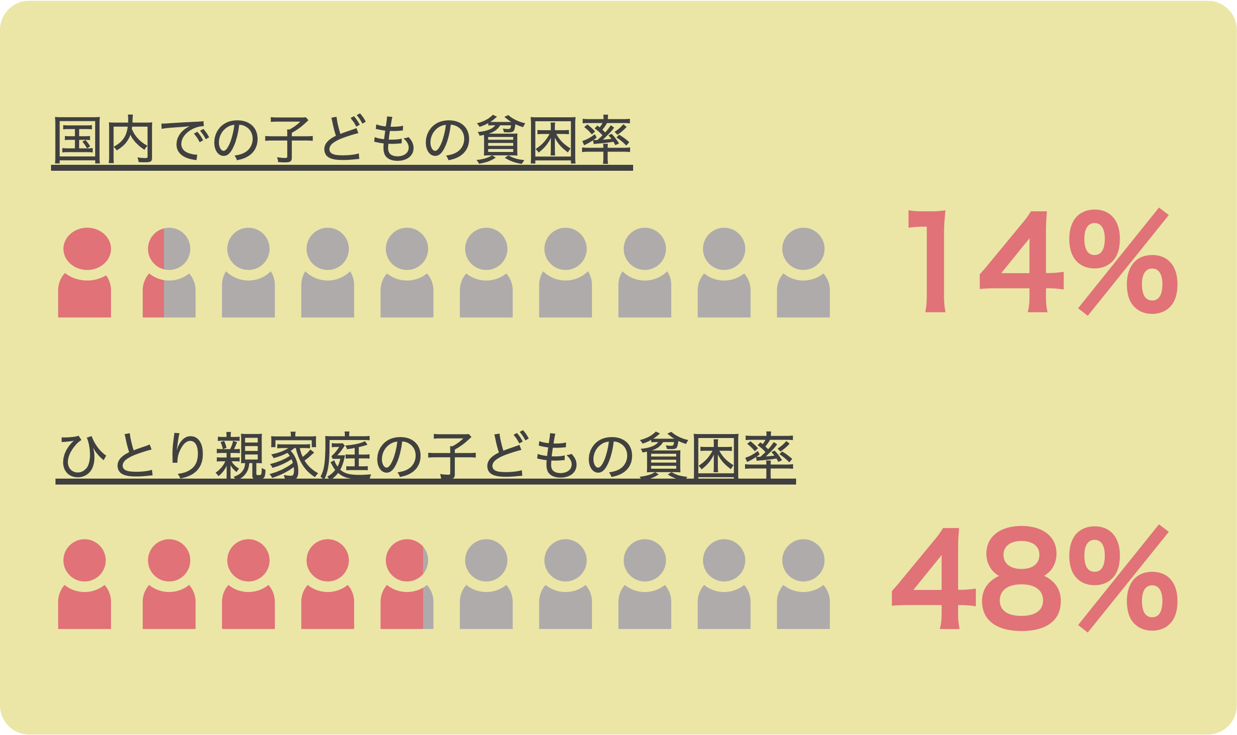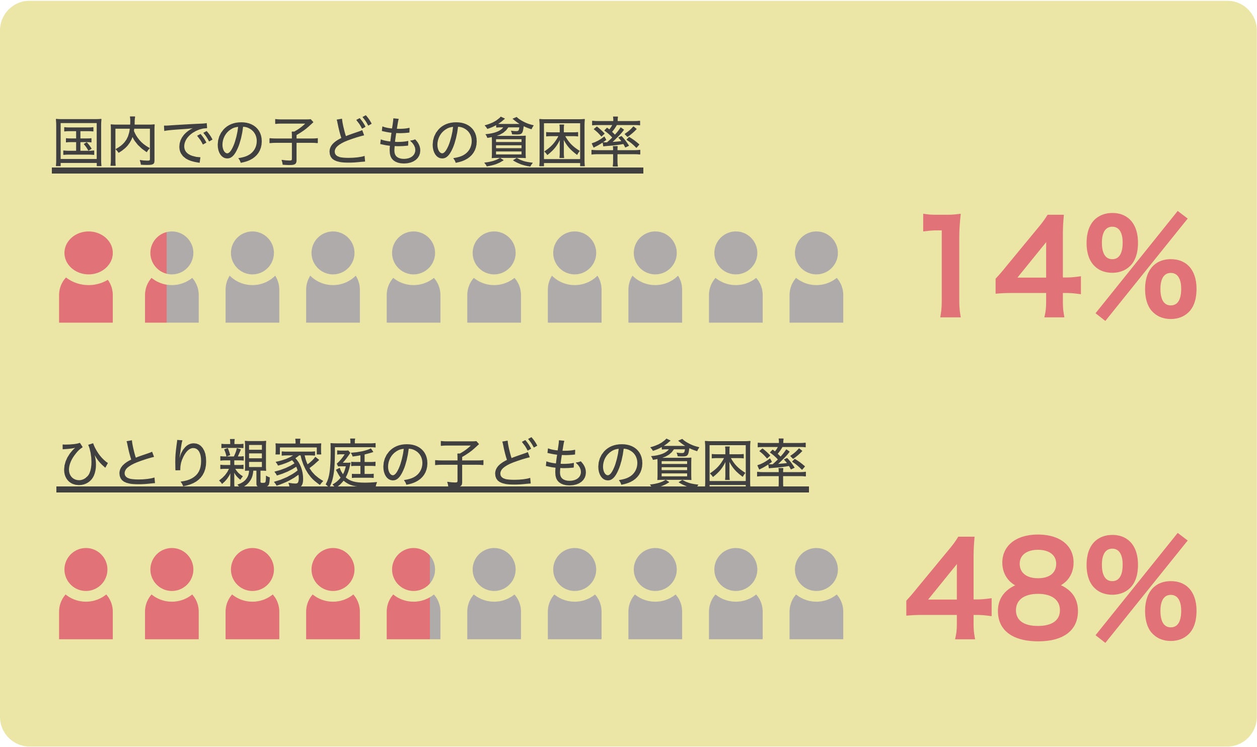 厚生労働省が2020年7月17日に公表した「2019年国民生活基礎調査」によると、2018年度の子どもの貧困率(新基準)は14%にものぼり、ひとり親世帯の子どもの貧困率は48.3%で、約2人に1人が相対的貧困の状態です。(*2)