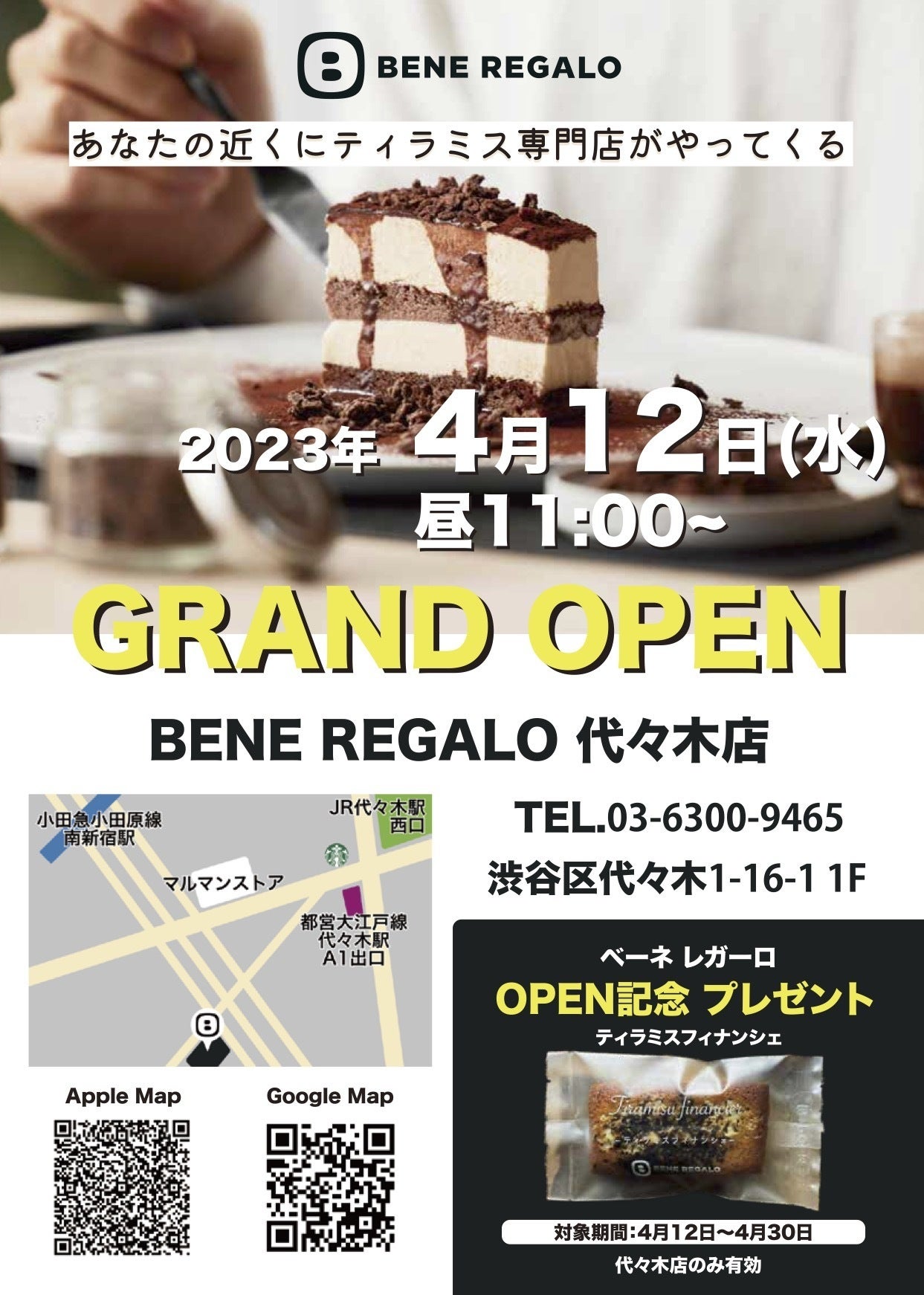 こんにちは。BENE REGALOスタッフです。2022年春に東京・あきる野市にオープンした「BENE REGALO」は誰もが豊かな時間を過ごせるよう、あらゆるシーンで最高のティラミスを提供するブランドになれるよう精進してまいりました。「Primo Tiramisu」は、ヒルナンデスの放送後わずか1時間で200個を売り上げ、通販で2ヶ月待ちになった人気商品となりました。そんな「BENE REGALO」が4月12日に東京・代々木に新店舗をオープンします!!!都心から遠く、ECサイトでも購入できなかった秋川店舗限定の商品が、アクセスの良い代々木にお店を構え、購入が可能となりました!皆様の支援無しには、ここまで進むことは出来ませんでした、、。改めてご支援いただき本当に有難うございました!!自慢のティラミスをもっと多くの人に届けられるように、まだまだ挑戦は続きます!!引き続きBENE REGALOを見守っていただけますと幸いです。よろしくお願い致します。\\\代々木店オープン記念///【代々木限定】 4月12日〜4月30日の期間限定で、ティラミスフィナンシェをプレゼント!ぜひ代々木店に足を運んで、このチャンスをお見逃しなく〜!【店舗詳細】ティラミス専門店「BENE REGALO」代々木店オープン日:2023年4月12日(水)住 所:〒151-0053 東京都渋谷区代々木1丁目16番地-1 グラースAMADA1F営 業 時 間:11:00~18:00 ※営業時間を変更する可能性もございます。定 休 日:不定休電 話:03-6300-9465【商品詳細】・Primo Tiramisu in Box ¥5,000・Primo Tiramisu in Bag ¥4,000・グラス入りティラミス ¥800・Tiramisu Financier ×2 ¥500・Tiramisu Macaron4個セット ¥2,000・マスカルポーネティラミスジェラート ¥500・マスカルポーネandエスプレッソティラミスダブルジェラート ¥800※ティラミスは冷凍でのご用意です。Primo Tiramisuは冷蔵庫で約1日解凍。グラスティラミスは冷蔵庫で約3時間半解凍。【BENE REGALO公式サイト・SNS】公 式 サ イ ト:https://bene-regalo.com/source_cafy-pattern_defaultメンバーサイト:https://eatpon.bene-regalo.com/Twitter:https://mobile.twitter.com/bene_regaloInstagram:https://www.instagram.com/bene_regalo/?hl=ja公式LINE:https://page.line.me/723qltjy?openQrModal=true【お問い合わせ】メール:support@bene-regalo.com電 話:042-808-7933