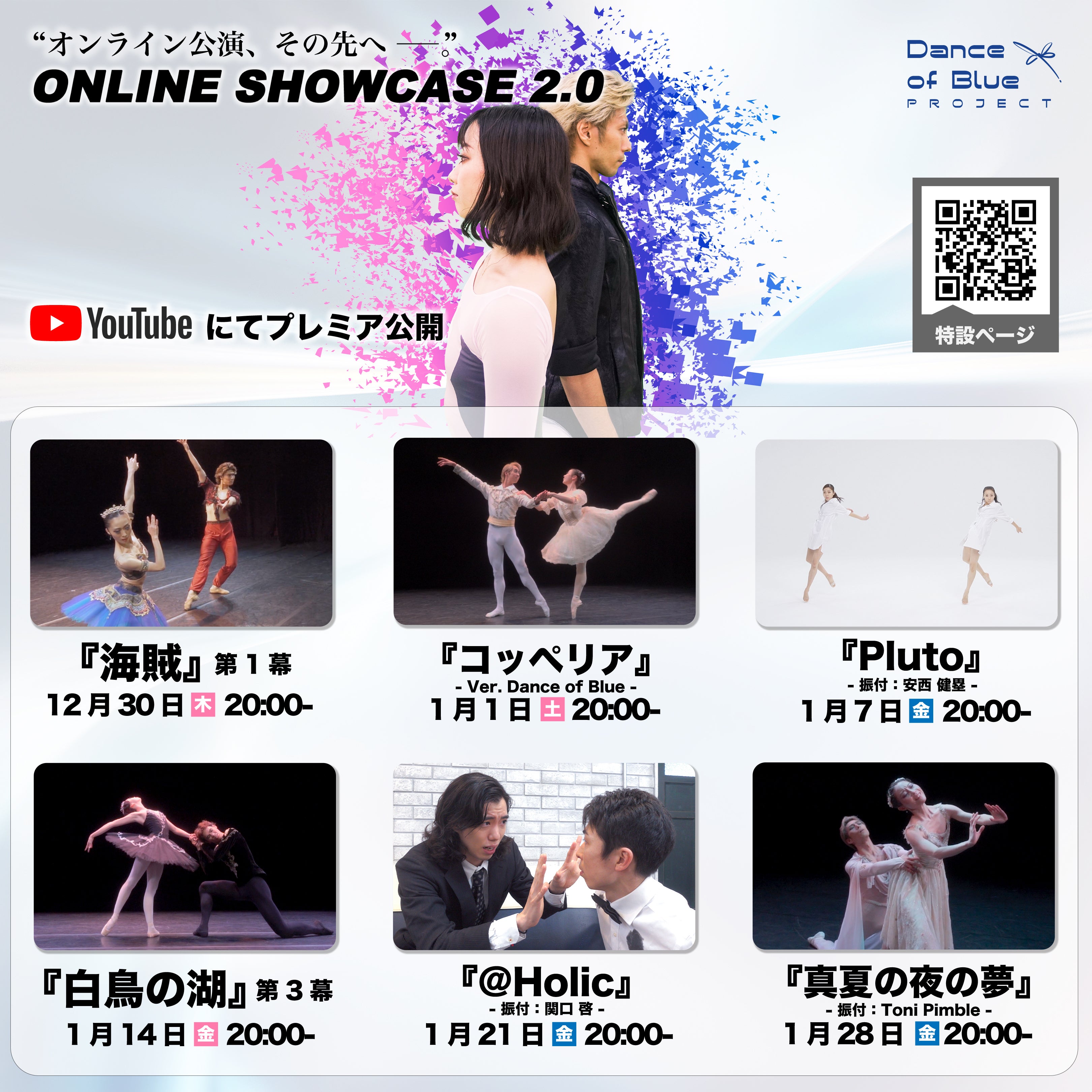 大変お待たせしました!『ONLINE SHOWCASE 2.0』全演目の配信が2/11(金)をもって無事に完了致しました!皆様のご支援無くしては達成できなかった本企画、改めて皆様からの温かいご支援、ありがとうございました!▼配信動画はこちらからご覧いただけます▼https://danceofblue-os2.studio.site/尚、リターンのBlu-ray/DVDについてたくさんのお問い合わせを頂いております。『真夏の夜の夢』配信時期が延長になってしまった影響もあり、現在全ての演目のBlu-ray/DVDへのデータの編集作業が完了し、急ピッチにて製作を進めております!商品発送の際はこちらの“活動報告”およびSNS等でお知らせさせて頂きますので、皆様のお手元に届くまで今暫くお待ちください!また近日中にDance of Blue Projectより、新企画の発表があります!支援者コミュニティでも発表をさせて頂きますので、引き続き応援の程よろしくお願い致します!