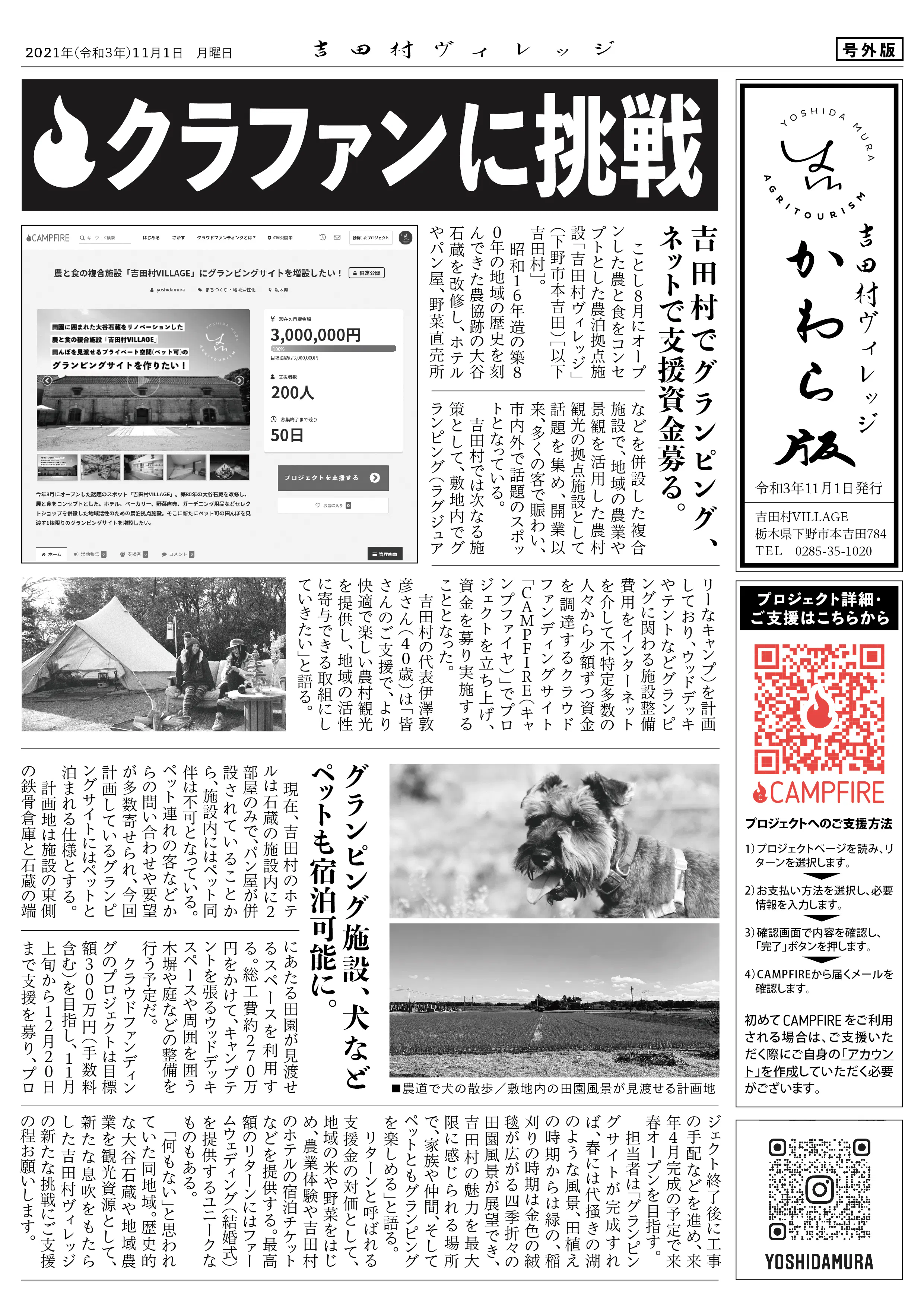 いよいよ吉田村の新たな挑戦「農と食の施設「吉田村VILLAGE」にペット可のグランピングサイトを作りたい!」のプロジェクト、選挙戦のような40日間が始まりました!
