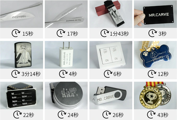 MR.CARVEは工業用グレードで、出力は200W以上のため、全ての金属、革、不透明なプラスチック、スプレー塗装(板/ガラス/紙/金属など)、コーティングしていない大理石/陶磁器、玉石、黒いアクリル、プリント基板、チップ、不透明なシリコン製品などに簡単に刻印できます。