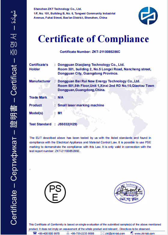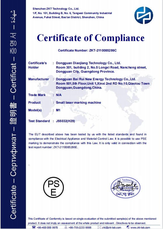 A:機器本体のPSE認証(丸形)と電源コードのPSE認証(ひし形)は取得完了です。