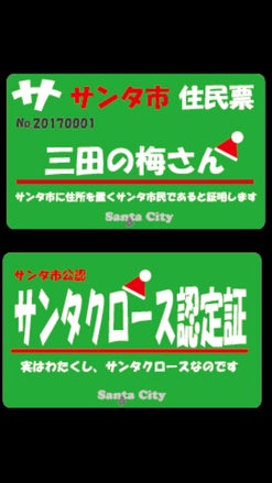 三田の梅さんです。 11月25日現在のサンタ市の人口が5名になりました。早速にありがとうございます。 三田市の住民票、職員証を画像であげていますが、もう少し体裁よく整えてお届けできると思います。 クリスマスシーズンにお使いいただけるようには、プロジェクトに記載している申し込みフォームから記載するお名前やお送りするメールアドレスなどをお伝えいただくと、できるだけ早く送るように作業にかかります。 あなたも誰かのサンタになれる、そんな提案に共感いただける皆さんにとって今年のクリスマスシーズンが最高に楽しいものになりますように。