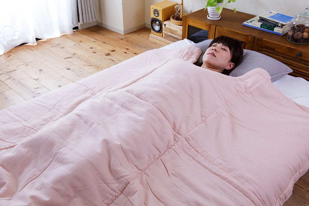毛布のように、お手持ちの布団と一緒にお使いいただく事でより暖かくお休み頂けます。