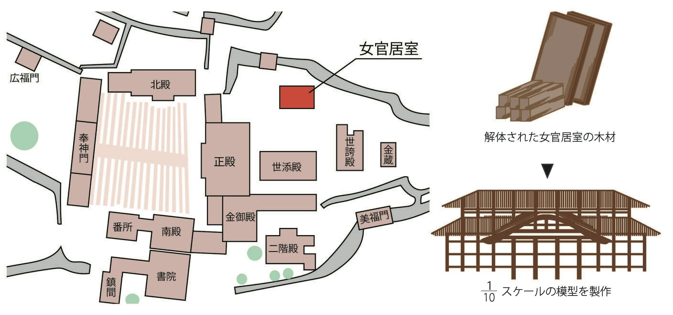首里城火災の際に全焼をまぬがれた「女官居室」に使用されていた木材を活用し、模型を製作します。首里城の一部であり、燃えずに残った女官居室の木材を使用することで、焼失前の首里城に使われていた材料を受け継いでいきます。