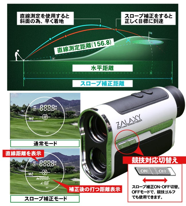 【スロープ補正機能】をOFFにすることで競技ゴルフでもご使用いただけます。