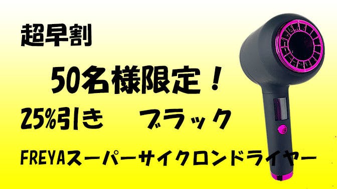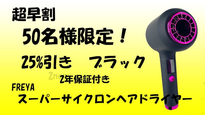 完成したFREYAスーパーサイクロンヘアドライヤー1個 メーカー希望小売価格 25,800円 (税・送料込み)のところ 超早割 25%引き! 19,850円(税・送料込み) 50個限定 2年保証 色ブラック