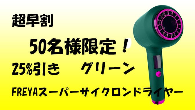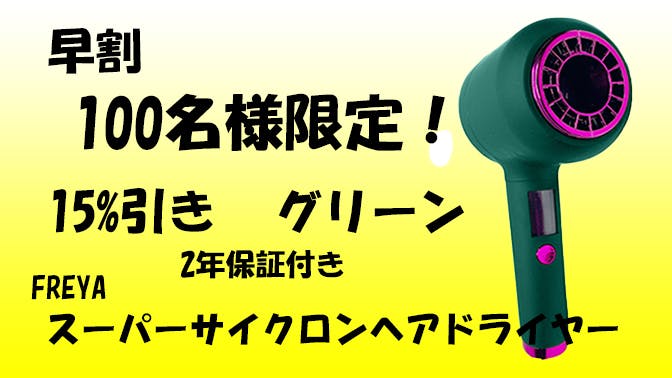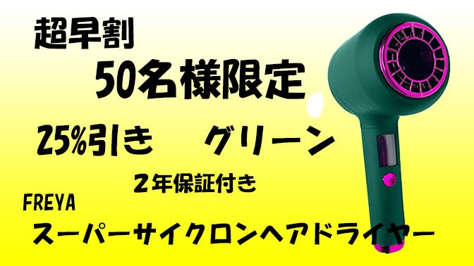 完成したFREYAスーパーサイクロンヘアドライヤー1個 メーカー希望小売価格 25,800円 (税・送料込み)のところ 超早割 25%引き! 19,850円(税・送料込み) 50個限定 2年保証 色グリーン