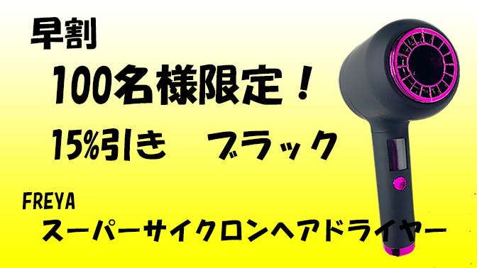 完成したFREYAスーパーサイクロンヘアドライヤー1個メーカー希望小売価格 25,800円 (税・送料込み)のところ 早割 15%引き!21,930円(税・送料込み) 100個限定 1年保証 色ブラック