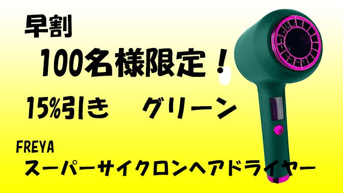 完成したFREYAスーパーサイクロンヘアドライヤー1個 メーカー希望小売価格 25,800円 (税・送料込み)のところ 早割 15%引き!22,430円(税・送料込み) 100個限定 2年保証 色グリーン