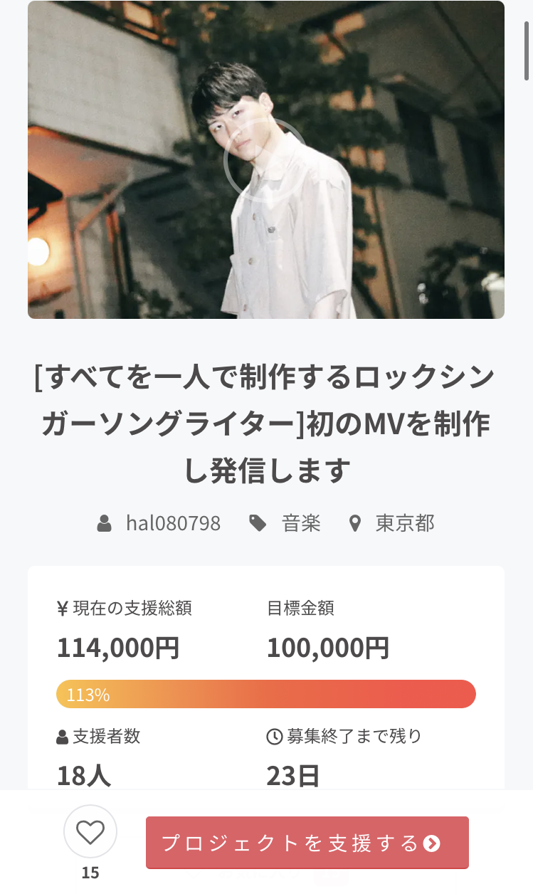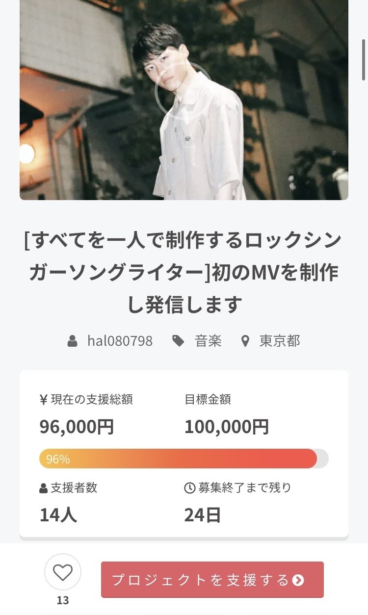 さて、昨日の24時からプロジェクトが公開され24時間が経ちました。今の支援総額はなんと、96,000円。正直、始める前は予想していませんでした。ポーンと越えられたらいいな、なんて思ってましたが現実はそんなに甘くない、そう思ってました。ですが始まってみればどうでしょう、こんなにたくさんの人に支援していただいています。これ、金額の問題じゃなくて本当にたくさんの人に支えられていると実感していまして。僕が北海道から何の伝手もなしに上京してきて、本当のゼロから活動を始めてここまで来れたのが皆さんのおかげということなんです。それが今回形となってこうして現れたわけです。ゼロから始めることって本当に不安ばかりです。僕はそういうの楽しめる人間じゃないし、失敗したらどうしよう、とか考えることも多いです。だけどこうやって足を一歩踏み出してみないとわからないこともたくさんあって、今回は僕がこうして踏み出した結果こんなにも多額の、多くの方からの支援をたった1日でいただきもう、もう、感無量です。今日は24時間経つまで結果は見ないでおこうと思っていたんですね。でも仕事帰りの電車内で何気なくメールを確認したら、campfire(このサイトです)からの「支援者が現れました!」のメールが多数・・・僕あまり泣いたりするタイプではないんですが、始める前のめちゃくちゃ不安だった気持ちからの安心とこんなにたくさんの人に支援してもらっているんだっていう実感から思わず目に汗がたまりましたね。汗が。ああ、俺が今までやってきたことは必ずしも正解じゃないかもしれない。だけど何一つ無駄なことはなかっただろう、そう思えました。今何かに挑戦してる人、挑戦しようとしてる人。日々僕の歌を聞いてくれてる人、今回このプロジェクトで初めて僕の存在を知ってくれた人。いろいろな人がいるとは思いますが、ぜひ僕の背中を追うのではなく、僕の隣に立っていてほしいです。そして夢みたいな景色を現実に、皆さんの目に見せたいです。僕の夢、まだまだ終わらないです。初日、終了しました。あと1か月弱ありますが、YouTubeにオリジナル曲を自分で撮ったビデオで投稿しようと色々考えています。YouTubeの方でもどうかチャンネル登録して僕の活動を見守っていただけると嬉しいです。そして12月には撮影が始まります。気合い入れてこの1か月過ごしたいと思います。引き続きご支援のほどよろしくお願いします。長文、駄文ですが失礼します。