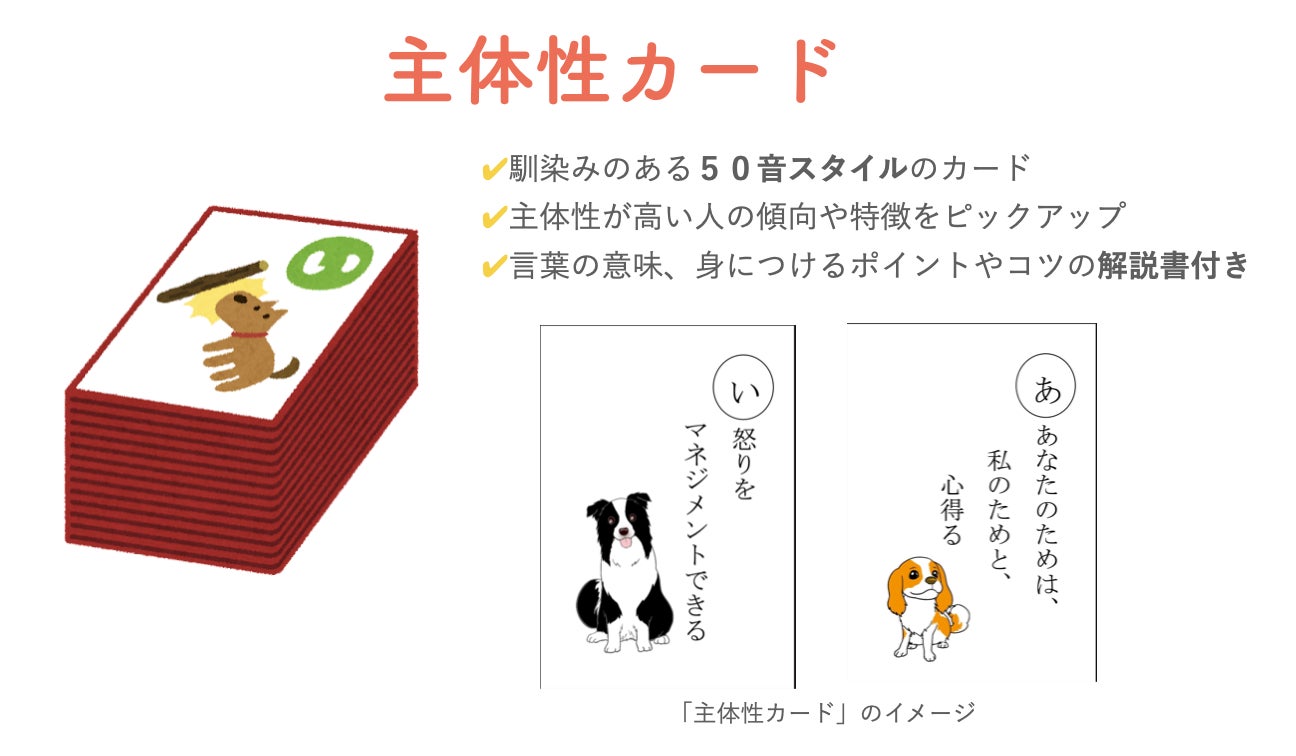 また、これまで様々な講座を展開していく中で、どうしても主体性については頭で理解するレベルで終わってしまう人が多いことも気になっていました。頭でなく心で分かって実践に繋がる学びは、ワーク中心がよく、テキストなどの知識や情報は少なく、遊び心があるものを作りたいと考え、「主体性カード」作成を手がけました。