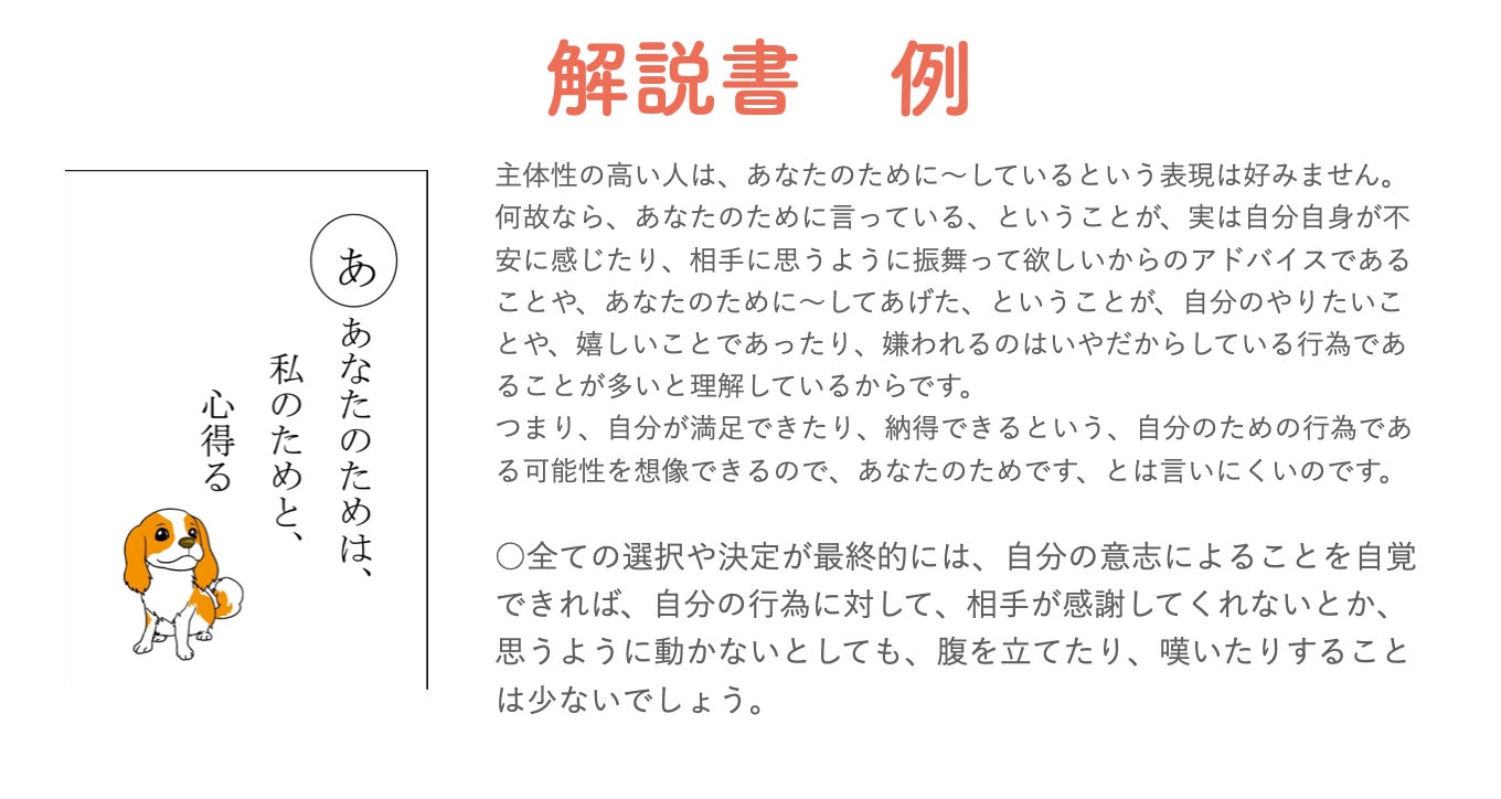 気に入ったカードを何枚か身近に置いておくだけでも効果がありますが、ご自分が特に気になるとか、取り入れたい言葉のカードがあれば、選んで、ご自分の心と向き合ってみて下さい。ご自分の性格の特徴や、行動態度の傾向を理解できるだけでなく、主体性を高めるための考え方や方法を身につけるヒントが見つかるでしょう!