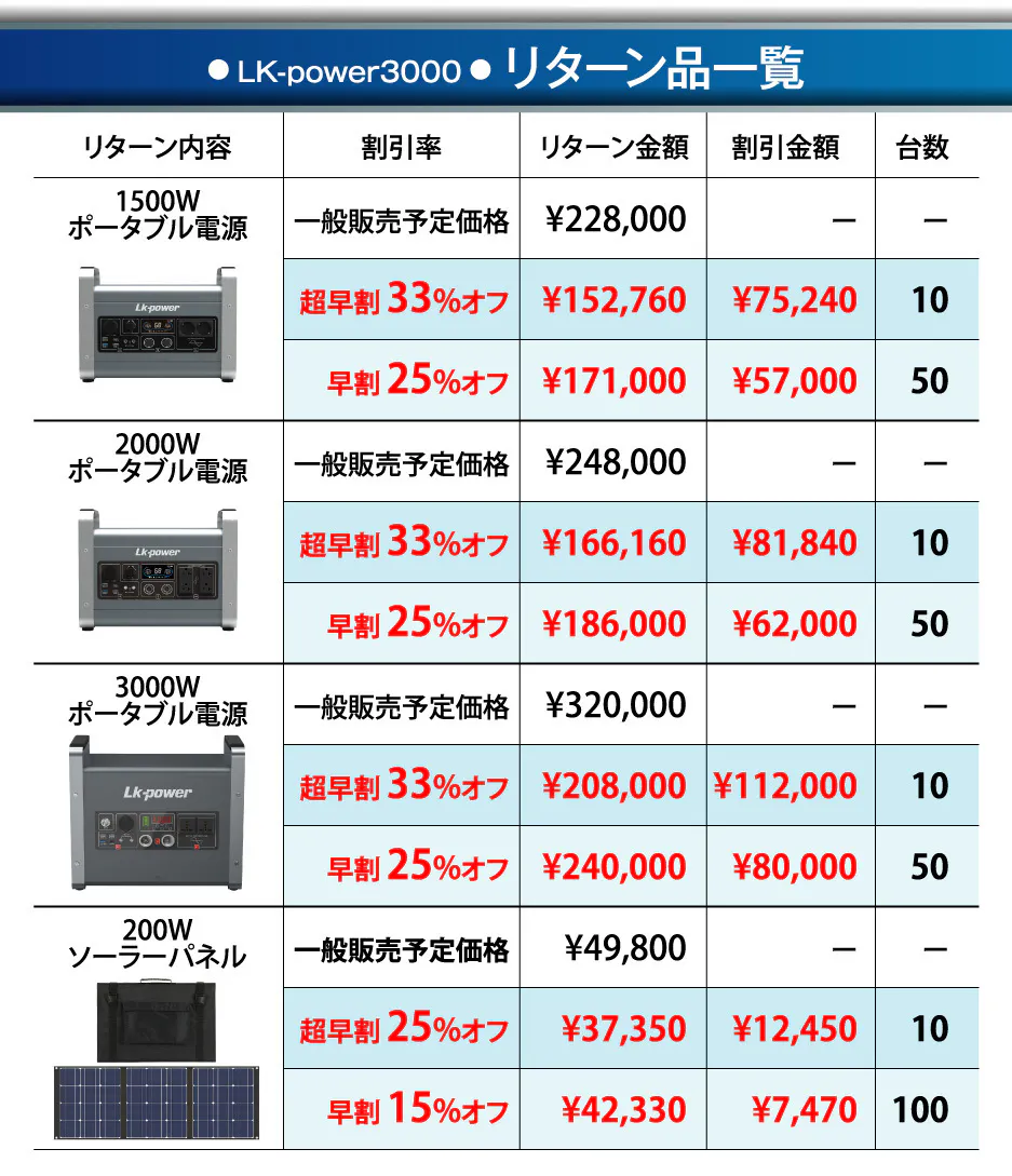 リターンに関しまして、早期ご支援ほど割引率が高くなりお得になります。
