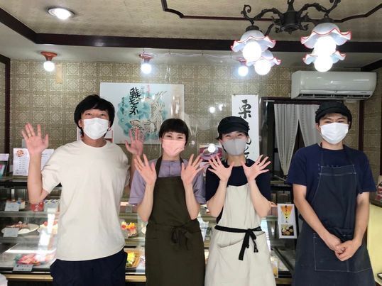 左から2番目が元祖鯱もなか本店4代目の私です!一緒に働くスタッフがお店を盛り上げてくれています
