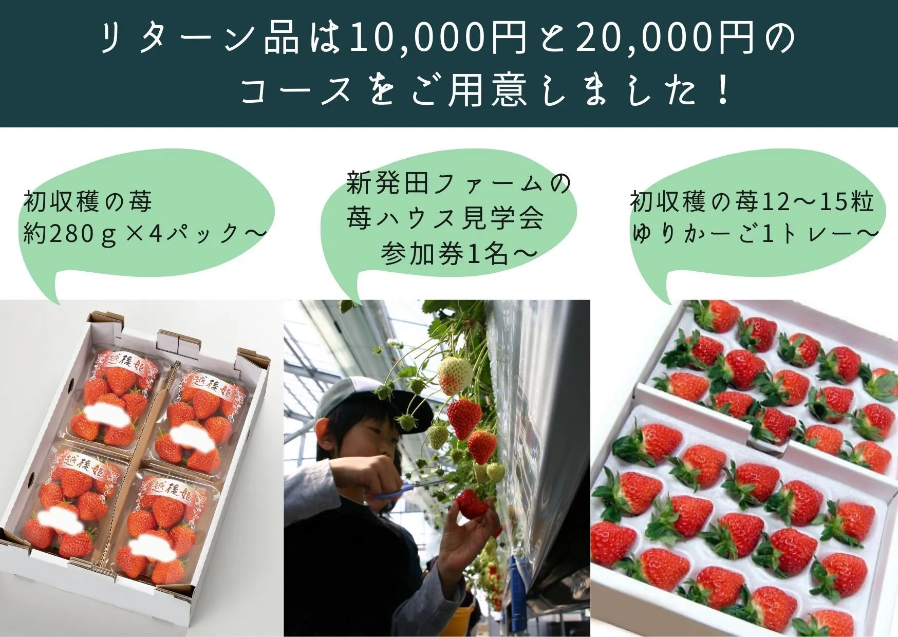 私たちのプロジェクトにご賛同頂き、寄付をしてくださった方にはリターン品として『お土産付き!新発田ファームの苺ハウス見学会参加券』や、『初収穫の越後姫12~15粒ゆりかーご1トレー』『初収穫の越後姫約280g×4パック』等を用意させて頂きました。詳しくはリターン品ページをご確認ください。