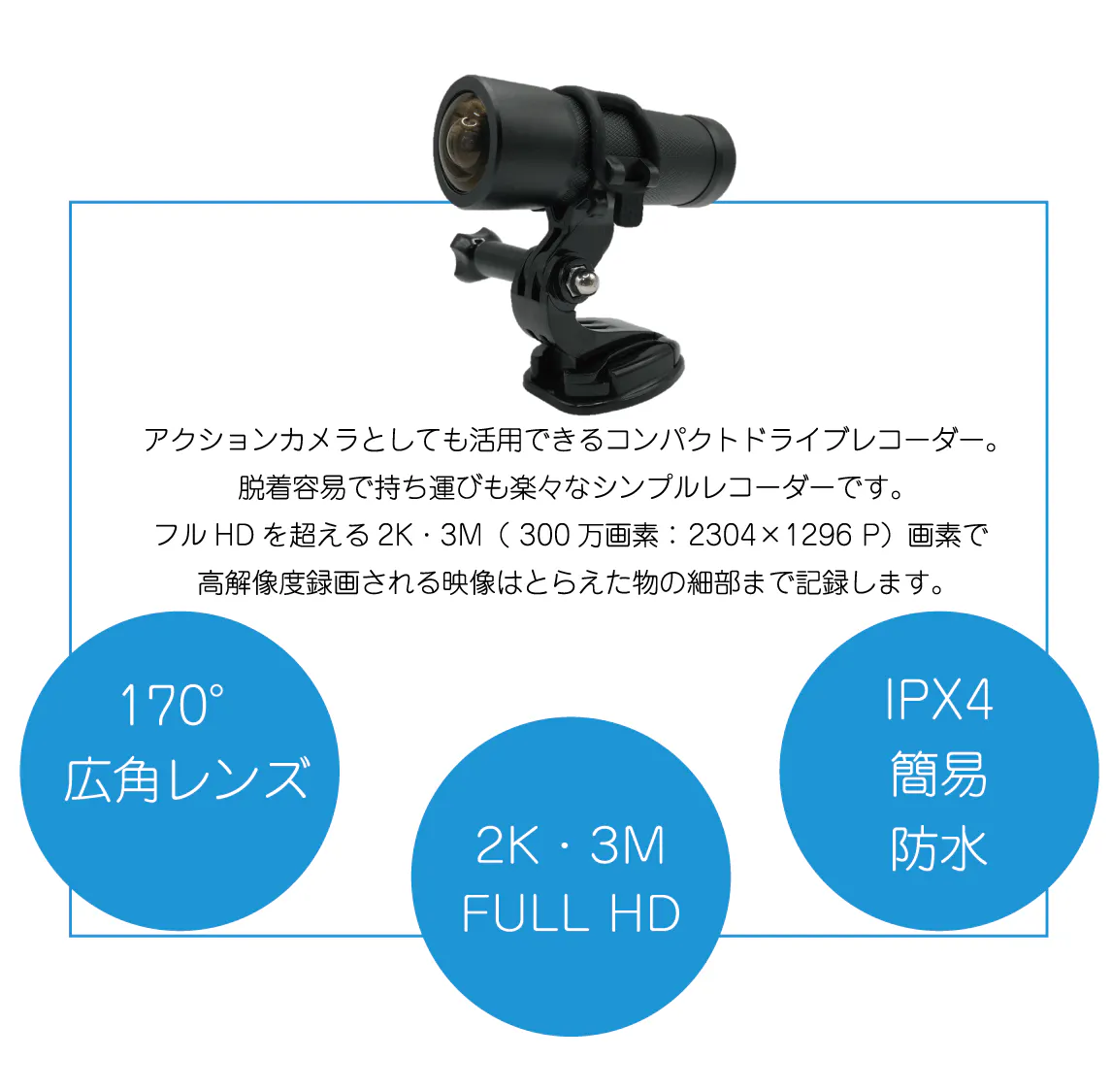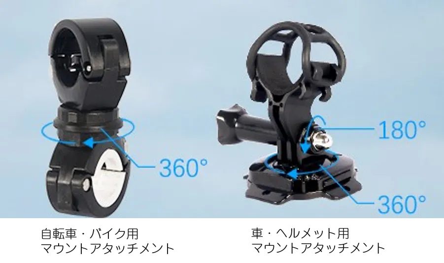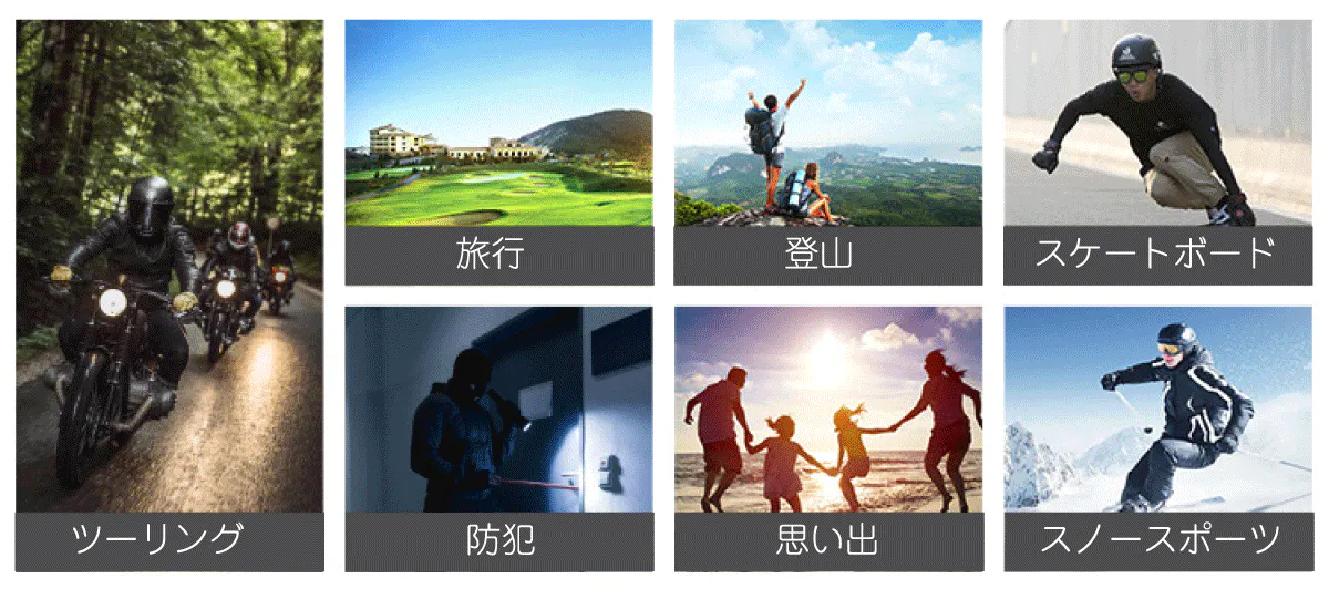自転車、バイク、車、スポーツならスキー、スケボー、登山などの撮影に適し、どこでも手軽に使い始めることができます。