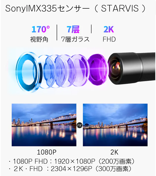 170°視野角の広角レンズで広がりのある映像を2K・FHD高解像度、高品質録画で記録を残します。