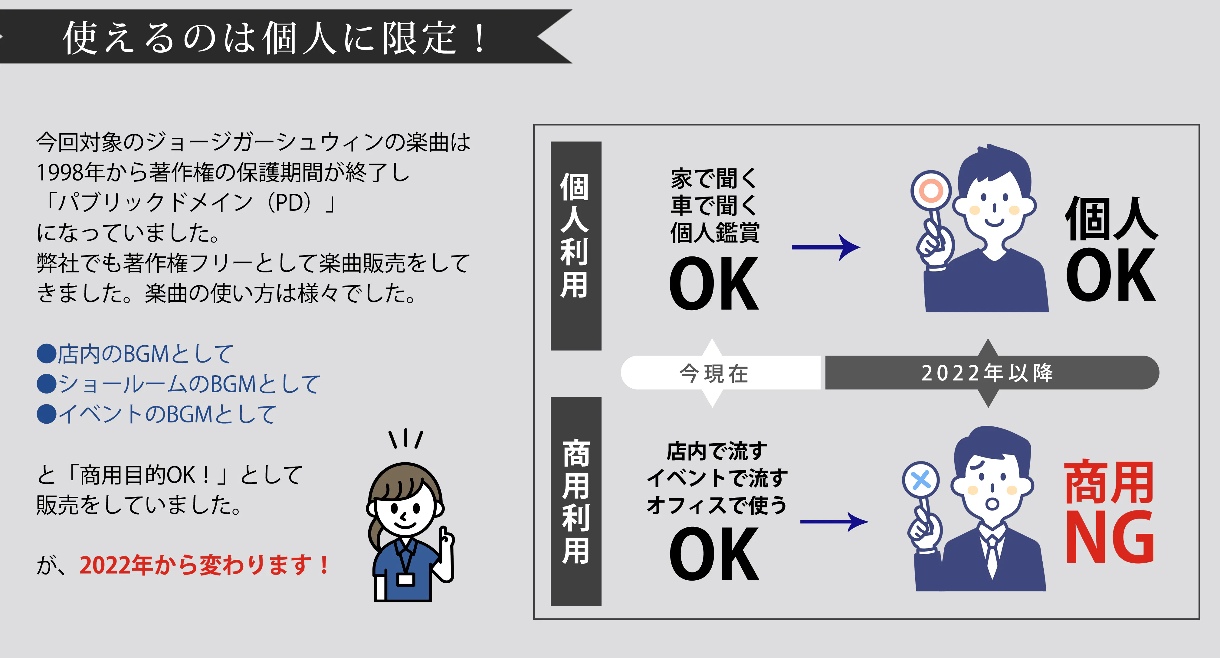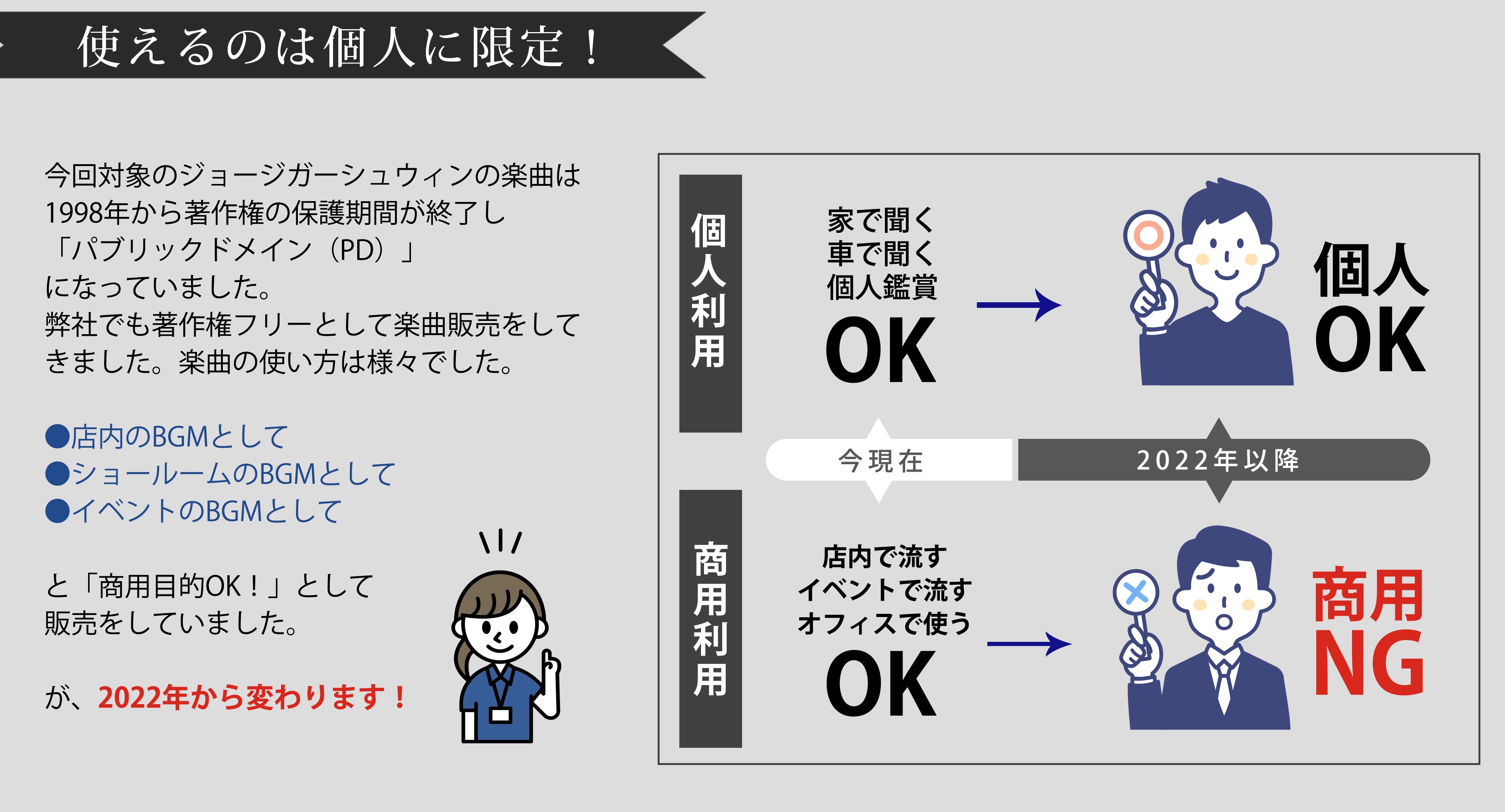 1998年5月22日以降、パブリックドメイン(PD)としての取り扱いOKで著作権消滅していたジョージ・ガーシュウィンという作曲者の音楽が、急に著作権復活してしまうことになって、また著作権管理団体に管理されることになったんです。