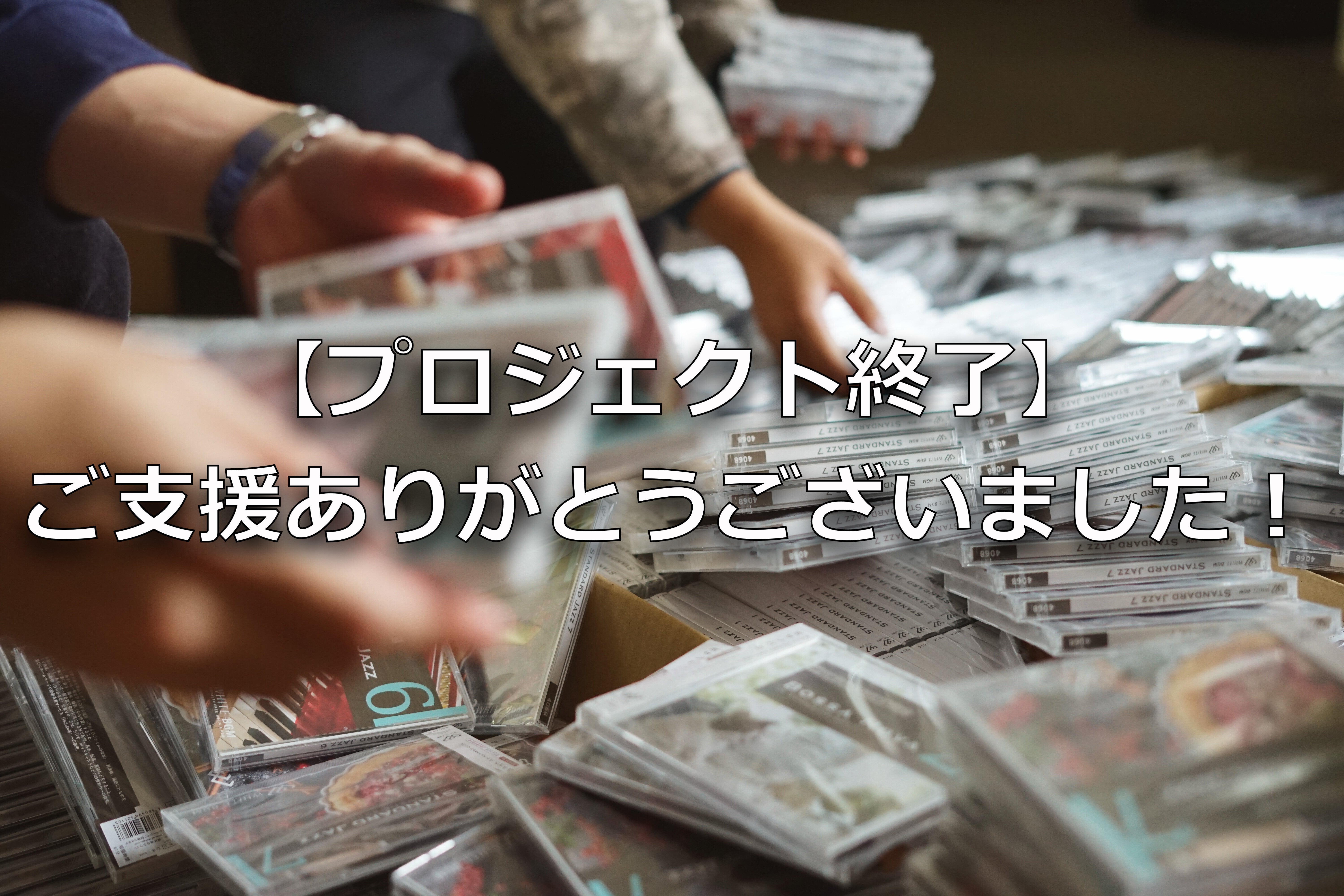 2021/12/27 12:35お世話になっております。株式会社ホワイトです。12月24日(金)にこのプロジェクトは無事終了することができました。最終的な結果は・・・◎支援者:428人◎支援総額:2,591,121円 ◎目標達成率:259%大成功でプロジェクトを終えました。たくさんの温かいメッセージとご支援、本当にありがとうございました。さて、今回のプロジェクトを終えて、現在、集計及び商品の発送準備に取り掛かっております。プロジェクトにも記載しておりました、1月末までにはご支援いただいた皆様のお手元に商品が届くよう準備していますので、ぜひ楽しみにお待ちくださいませ。今回、『著作権の復活』というイレギュラーな事態をきっかけに、クラウドファンディングを行う運びとなりましたが、改めて、このプロジェクトを行って本当に良かったなと感じます。それは、在庫をはけることができるという現実的な側面もありますが、何より、支援していただいた多くの方々に、行き場を失ってしまっていた楽曲を楽しんでいただけるということが一番の励みです。今回のこプロジェクトをきっかけに、商用だけでなく個人のお客様にも楽曲の提供が出来ればと考えております。これからも株式会社ホワイトは、より良いBGMを皆様にご提供できるよう、日々邁進してまいりますので、今後ともよろしくお願い致します!改めまして、この度はご支援いただき本当にありがとうございました! もっと見る【8枚全部セット完売】ありがとうございます!