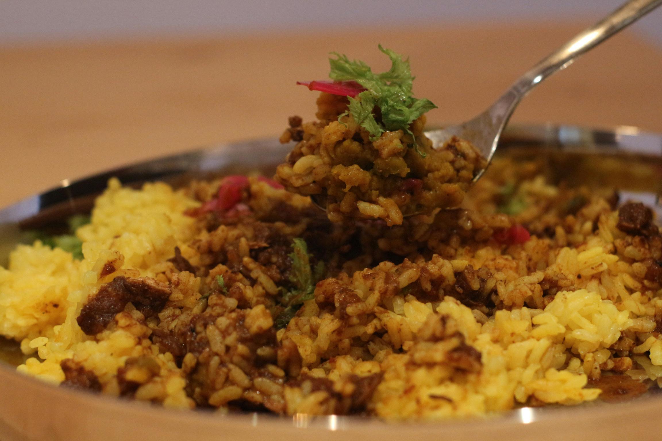 スパイスのきいたカレー、やさしい旨みの豆スープ、たっぷりの野菜のおかずを全てライスに混ぜ込んで食べれば、心も体も元気になるひと皿です。