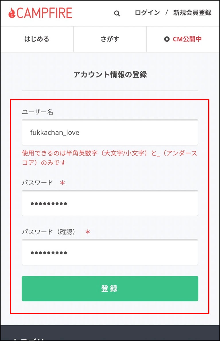 8、任意のユーザー名(英数字3-32文字)とパスワードを入力。