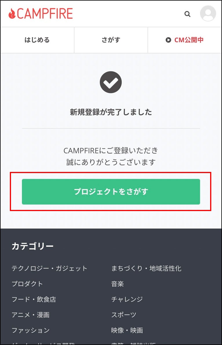 9、アカウント登録が完了したら「プロジェクトをさがす」をタップ。