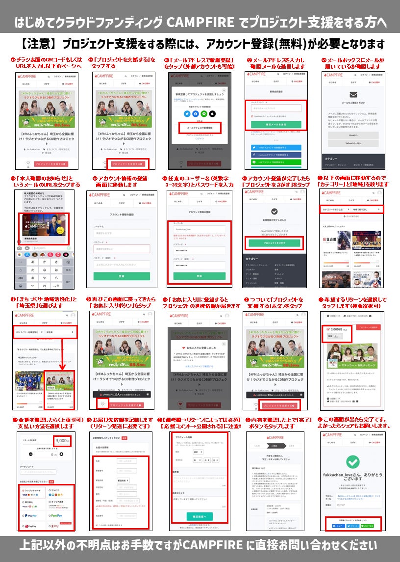 上記以外の不明点はお手数ですがCAMPFIRE に直接お問い合わせください。
