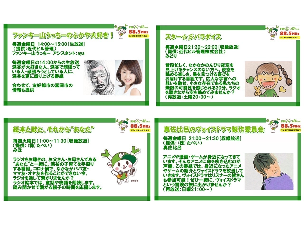 今回のオリジナルCD制作は、FMふっかちゃんでパーソナリティもつとめる4人のアーティストを中心にプロジェクトが進行していますが、FMふっかちゃんにはその他にもたくさんのパーソナリティがいて、それぞれ魅力的な番組を放送しています。このたび、それらの番組のCM動画が完成しましたので、少しずつご紹介しています。今日は4つの番組のCM動画をご紹介します。ファンキー山うっちーのふかや大好き! (ファンキー山うっちー アシスタント:aya)金曜日14:00~15:00[生放送]山うっちーさんとayaさんの絶妙な掛け合いが好評な金曜午後の生放送です。スター☆彡パラダイス (みどり)水曜日21:30~22:00[収録放送](再放送:土曜20:30~)ラジオを通して、天文や星についての話が聞けるステキな番組です♪絵本と歌と、それから“あなた”(みほ)火曜日11:00~11:30[収録放送](再放送:日曜日9:30~)童話や物語を朗読がラジオで聴ける番組です。朗読ゲストも募集しています!真佐比呂のヴォイスドラマ製作委員会(真佐比呂)金曜日21:00~21:30[収録放送](再放送:日曜21:00~) アニメや漫画・ゲームについての話やヴォイスドラマをお届けしている番組です!今回のCDも、深谷を、埼玉を、日本を元気にするためのCDとして制作していますが、普段の放送でも、深谷市内は88.5MHzで、埼玉や日本全国にはリスラジの放送で元気を届けています。これを機に興味を持っていただいた方、ぜひ実際に番組を聴いてみてくださいね♪そして、FMふっかちゃん一丸となって取り組んでいる今回のクラウドファンディング、ぜひご支援をどうぞよろしくお願いします!
