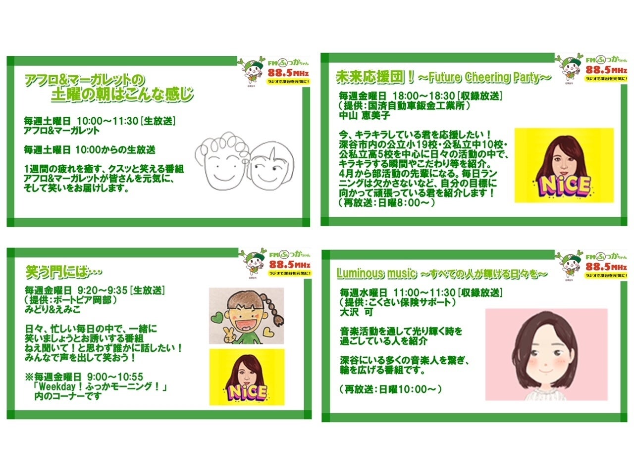 今回のオリジナルCD制作は、FMふっかちゃんでパーソナリティもつとめる4人のアーティストを中心にプロジェクトが進行していますが、FMふっかちゃんにはその他にもたくさんのパーソナリティがいて、それぞれ魅力的な番組を放送しています。このたび、それらの番組のCM動画が完成しましたので、少しずつご紹介しています。今日は4つの番組のCM動画をご紹介します。アフロ&マーガレットの土曜の朝はこんな感じ(アフロ&マーガレット )土曜日10:00~11:30[生放送]土曜の朝はこれで決まり!大喜利コーナーも人気の笑い満載の楽しい番組です♪未来応援団!~Future Cheering Party~(中山恵美子)金曜日18:00~18:30[収録放送](再放送:日曜8:00~)深谷市内の子どもたちにスポットをあてた番組です♪子どもたちの未来を応援します!笑う門には…(みどり&えみこ)金曜日9:20~9:35[生放送]毎週金曜日の「Weekday!ふっかモーニング!」内の人気コーナーです。Luminous music~すべての人が輝ける日々を~(大沢可)水曜日11:00~11:30[収録放送](再放送:日曜10:00~) 深谷市内の多くの音楽人を紹介し、繋げているステキな番組です!今回のCDも、深谷を、埼玉を、日本を元気にするためのCDとして制作していますが、普段の放送でも、深谷市内は88.5MHzで、埼玉や日本全国にはリスラジの放送で元気を届けています。これを機に興味を持っていただいた方、ぜひ実際に番組を聴いてみてくださいね♪そして、FMふっかちゃん一丸となって取り組んでいる今回のクラウドファンディング、ぜひご支援をどうぞよろしくお願いします!