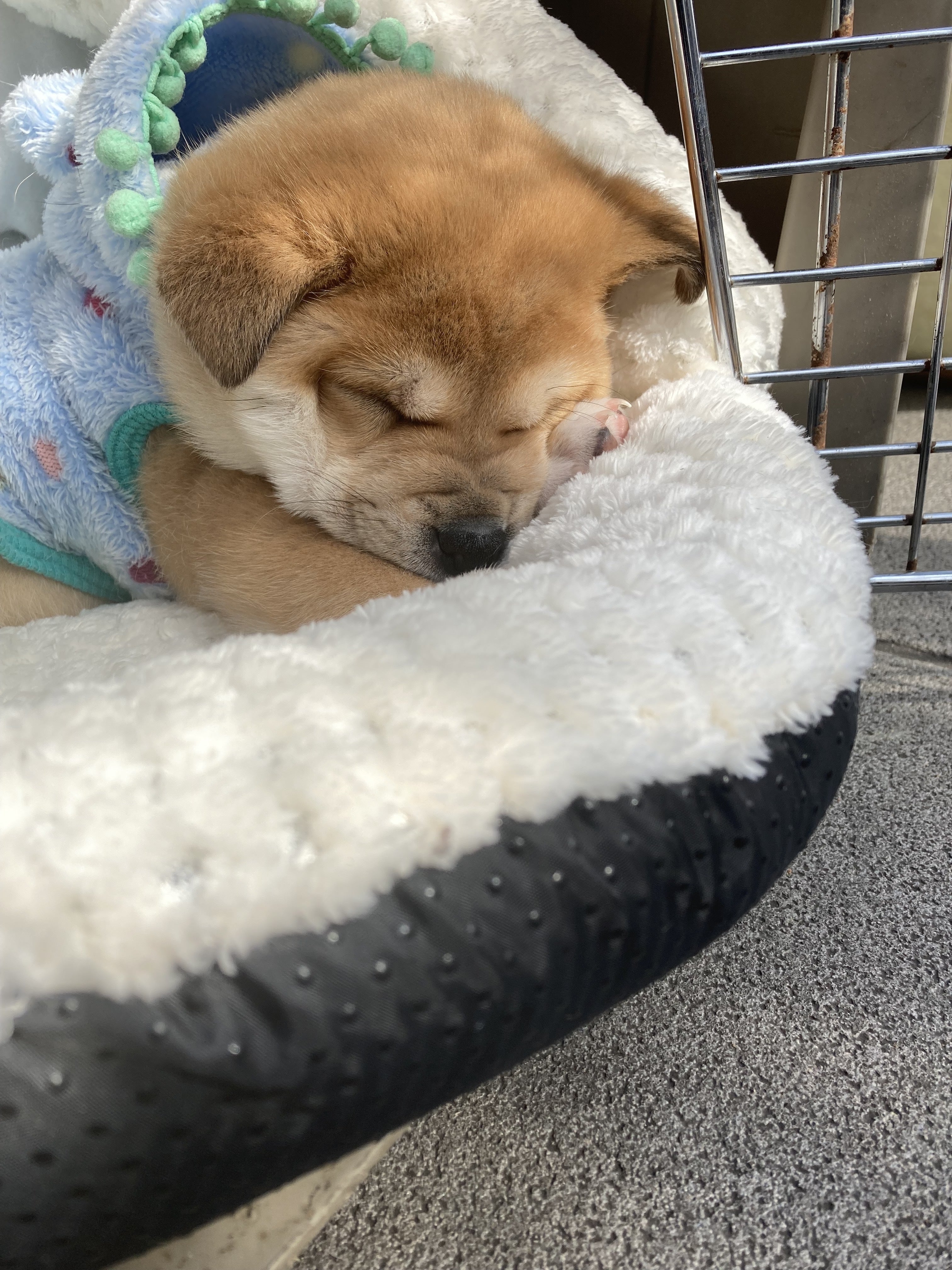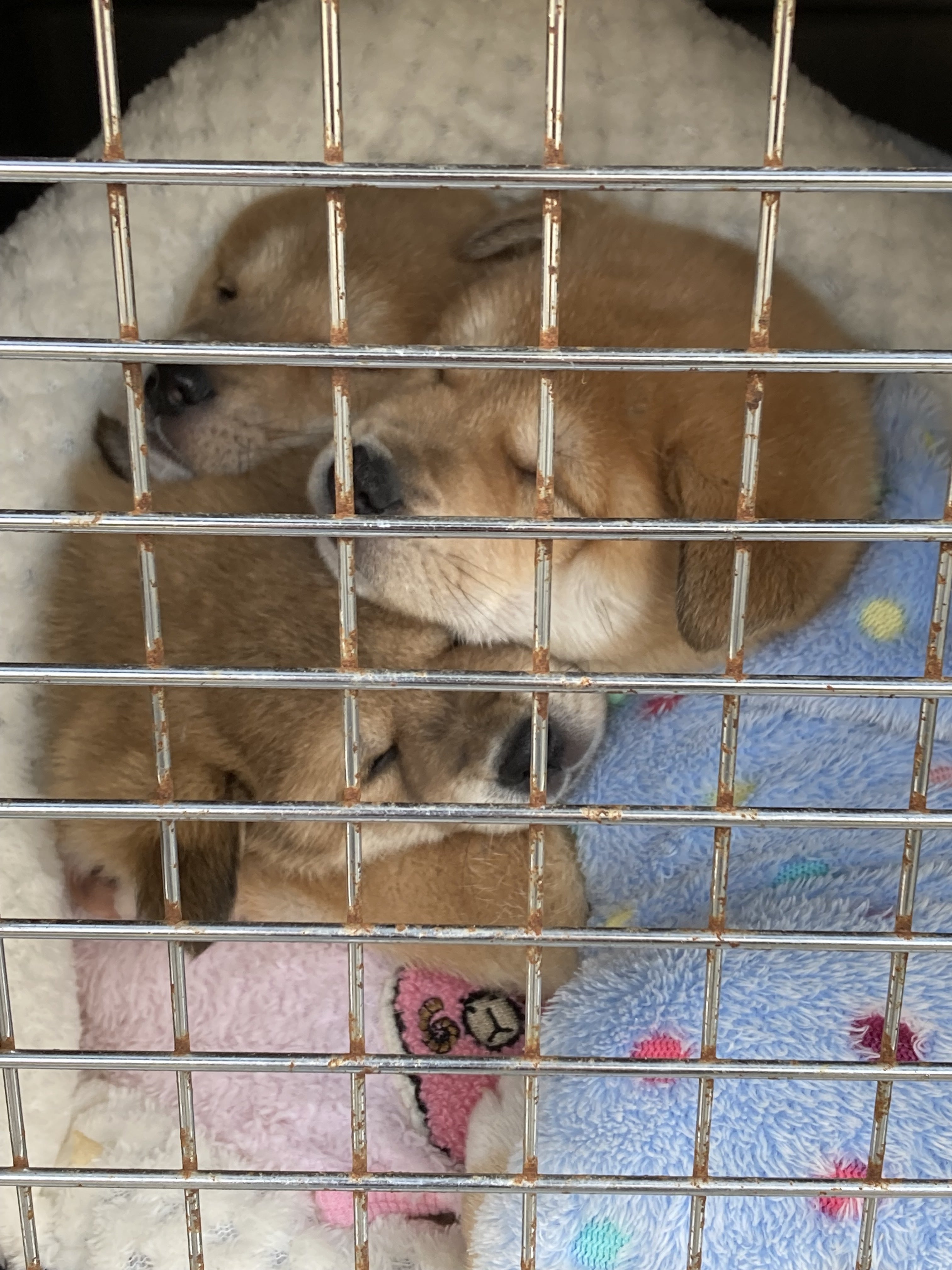 △帰りの輸送ケージで子犬だんごになって眠るさくら、あんず、ももちゃん