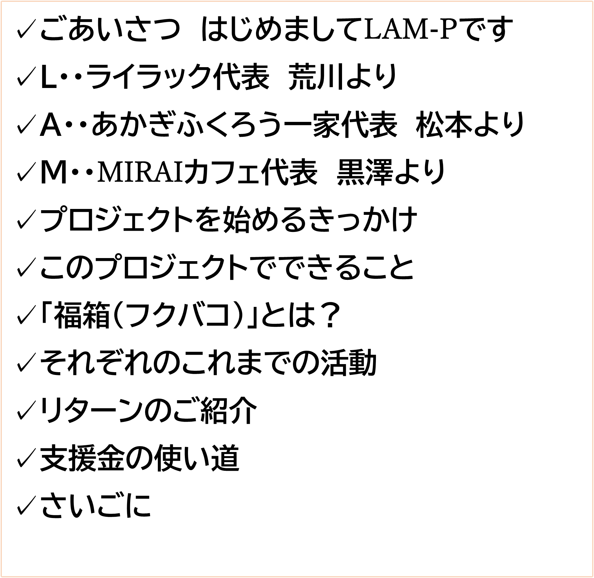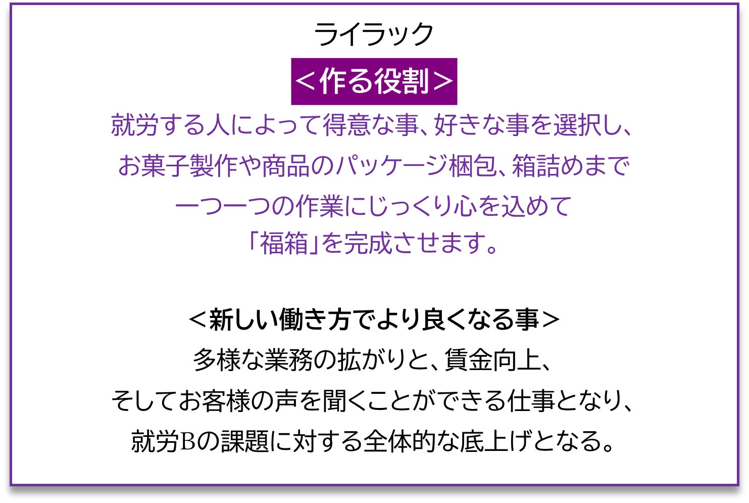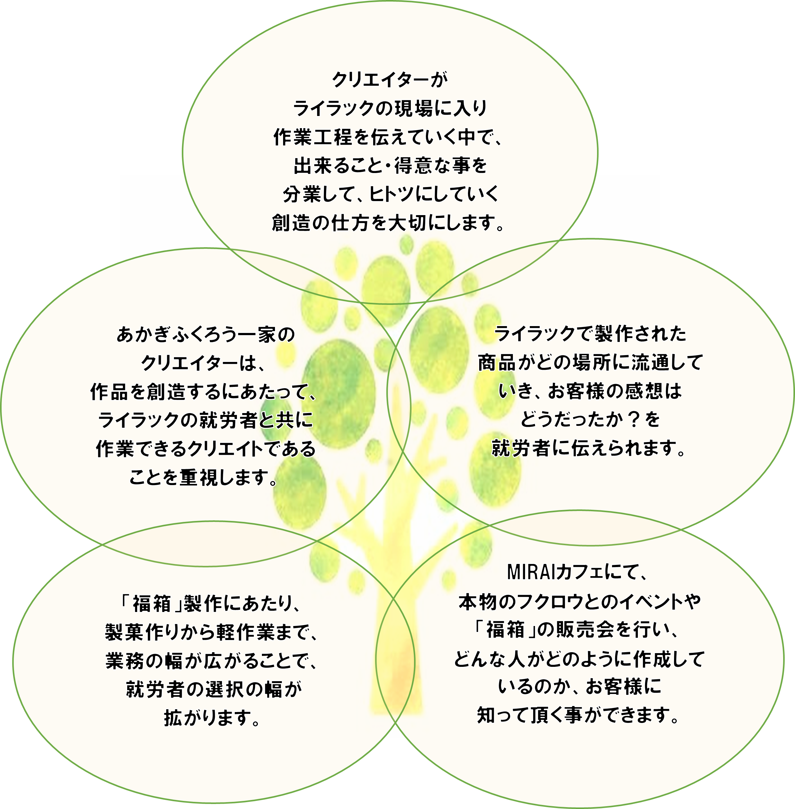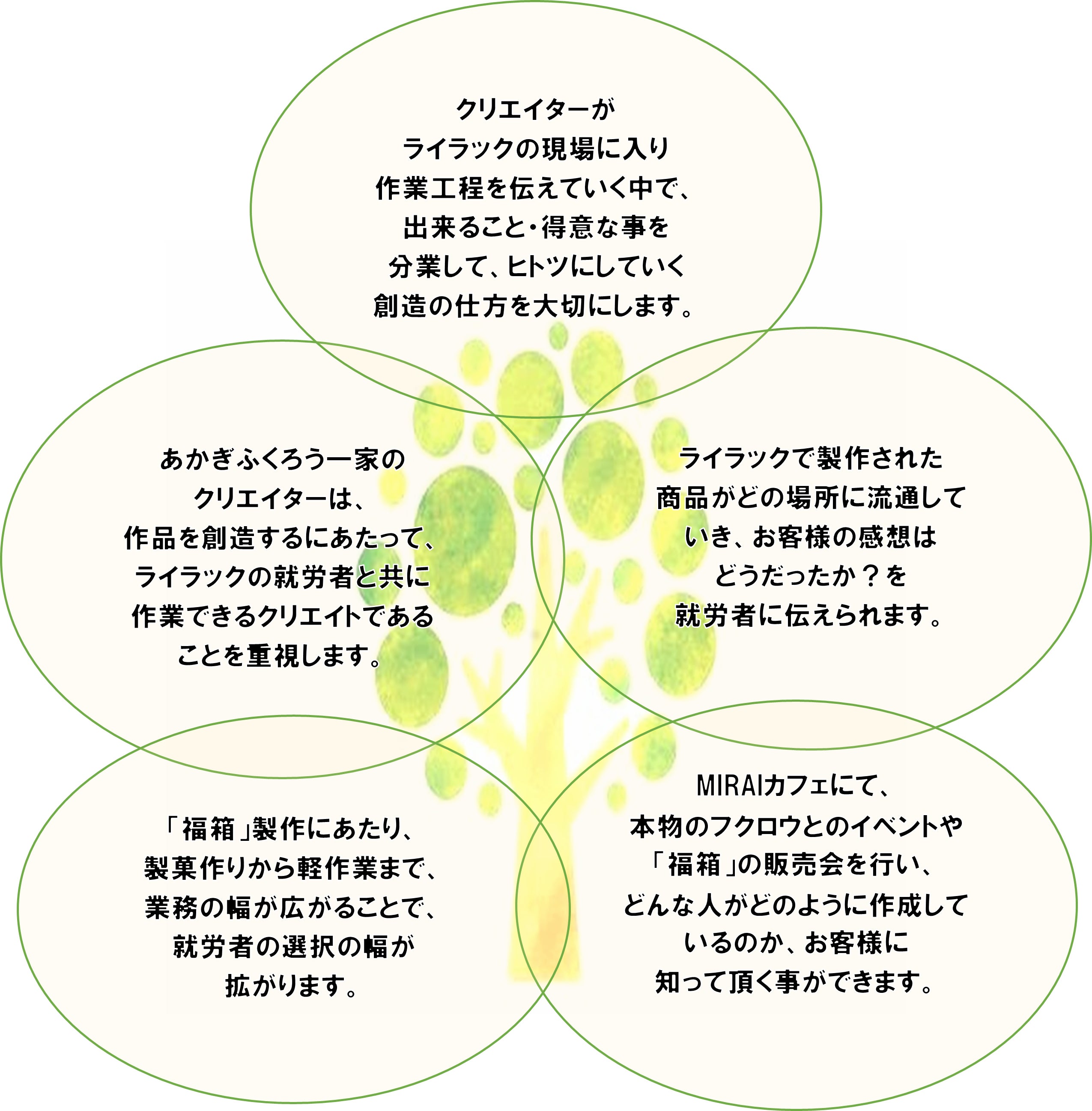 この度、私達と同じ思いを持つ、就労支援ライラックさん、MIRAIカフェさんと共に、新しいカタチを作っていこう!ということから、3者三様の得意なコトを並べて広げて、それぞれの豊かさを詰め込んだ「福箱」の商品開発を通したチャレンジをすることになりました。
