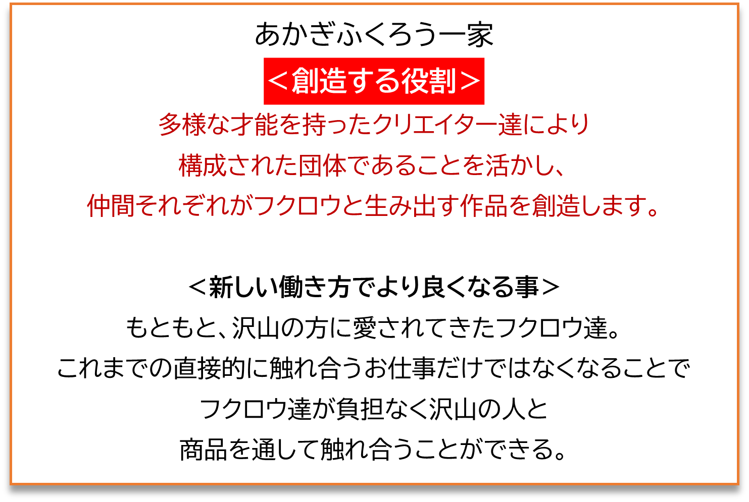 急ピッチで進められたフクロウ達の大移住により、フクロウが好きで集まったあかぎふくろう一家の仲間達は、アーティスト・クリエイター・動物業界従事者・セラピストetc・・。多様な職種経験を持つ人たちです。