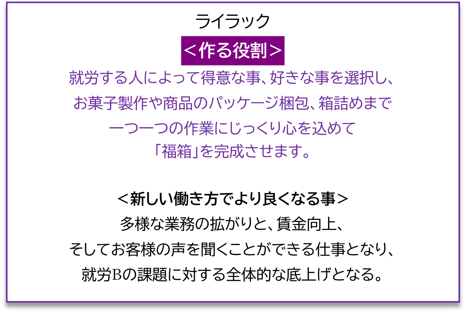 また、これまでの就労Bでの業務内容は内職が多く、ましてや就労者が業務内容を選択できる幅は限りなく狭い。それが就労している方のストレスとなる状況も感じていました。
