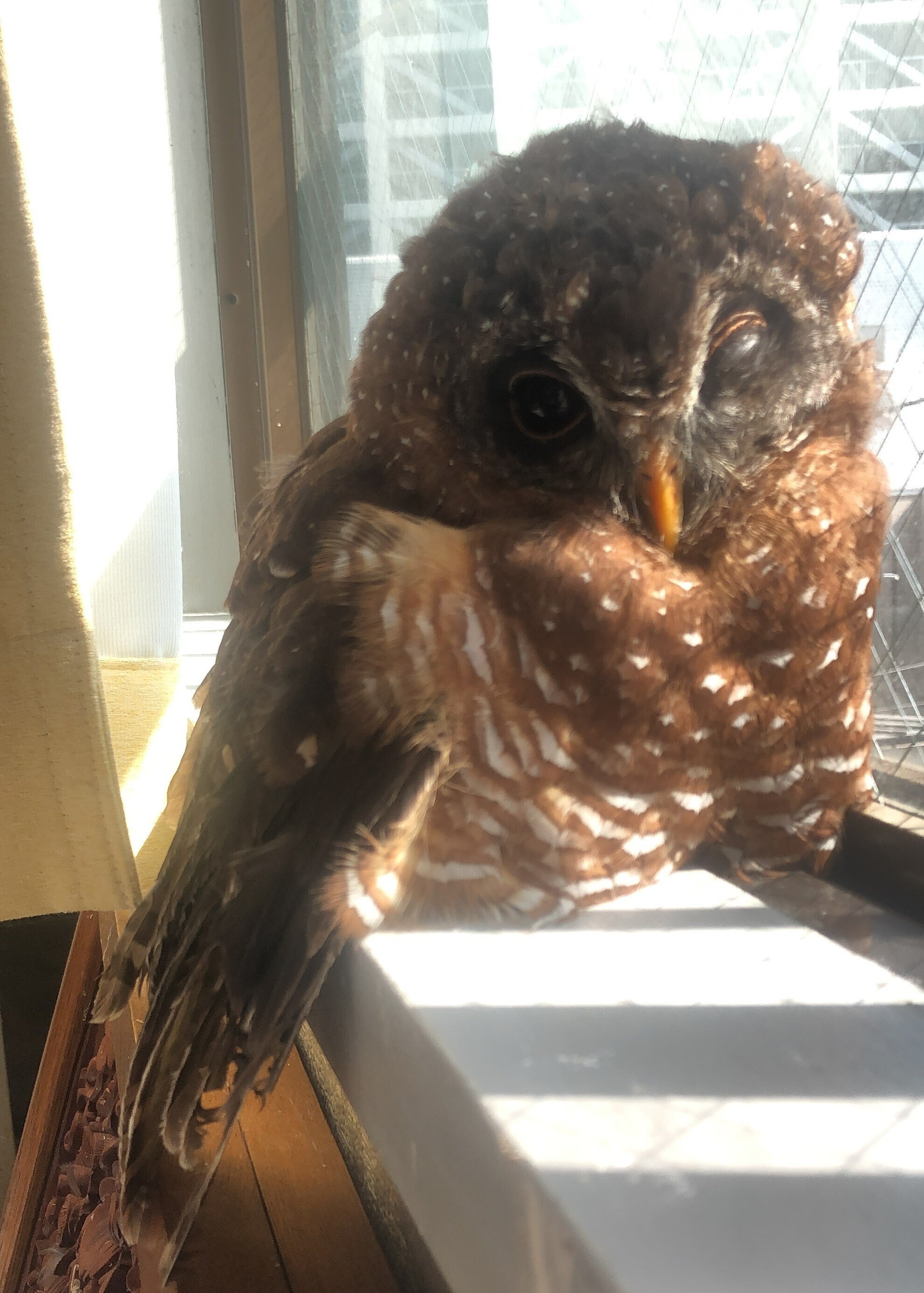 生まれつき視覚障害を持つアフリカヒナフクロウのキョウ