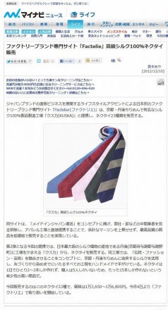 2012/12/11 11:02皆様 「Factelier by KUSKA」の販売を開始してから、数日ですが、 多数のメディアにご紹介いただきました! 本当にありがとうございます!! 2012.12.10 【マイナビニュース】ファクトリーブランド専門サイト「Factelie」高級シルク100%ネクタイ販売 http://news.mynavi.jp/news/2012/12/10/025/ 2012.12.10 【goo ニュース】ファクトリーブランド専門サイト「Factelie」高級シルク100%ネクタイ販売 http://news.goo.ne.jp/article/mycom/trend/mycom_728956.html 2012.12.10 【Infoseek ニュース】ファクトリーブランド専門サイト「Factelie」高級シルク100%ネクタイ販売 http://news.infoseek.co.jp/article/10mycom20121210p09 2012.12.10 【速報:@niftyニュース】ファクトリーブランド専門サイト「Factelie」高級シルク100%ネクタイ販売 http://news.nifty.com/cs/economy/economyalldetail/mycom-20121210-20121210009/1.htm 2012.12.10 【greenz.jp】メイド・イン・ジャパンが絶滅したら、日本人は誰にも見向きされなくなる?本物のメイド・イン・ジャパンを伝える「Factelier」に聞いてきました! http://greenz.jp/2012/12/10/factelier/ 2012.12.10 【はてなブックマーク】メイド・イン・ジャパンが絶滅したら、日本人は誰にも見向きされなくなる?本物のメイド・イン・ジャパンを伝える「Factelier」に聞いてきました! http://b.hatena.ne.jp/entry/greenz.jp/2012/12/10/factelier/ 2012.12.5 【産経関西】高級シルク100%ネクタイ発売 低価格化を実現 ファクトリエ: http://www.sankei-kansai.com/2012/12/05/20121205-063011.php 2012.12.5 【Fashion-J.com】KUSKA メイドインジャパン復活へ。第2弾は"京都・丹後"「クスカ」! http://fashion-j.com/blog/men/2012/12/kuska.html 引き続き、よろしくお願いいたします! もっと見る