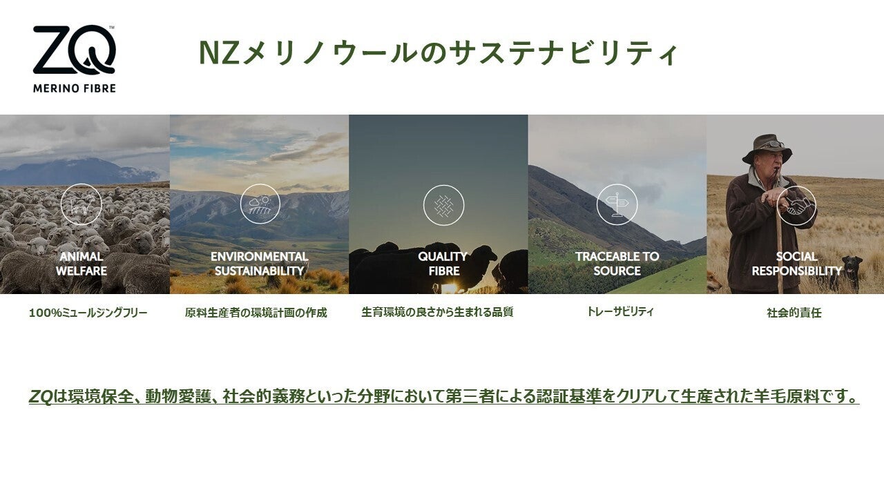 REDA ACTIVEが使用している原料は100%ニュージーランドメリノウールです。 ニュージーランドメリノウール認証機構である2006年に設立されたZQは、倫理的な羊毛生産に取り組むニュージーランドのメリノ生産者にとって誠実さの象徴です。ZQ生産者は、ZQ繊維の品質、動物福祉、環境への配慮、社会的責任の基準を満たしています。