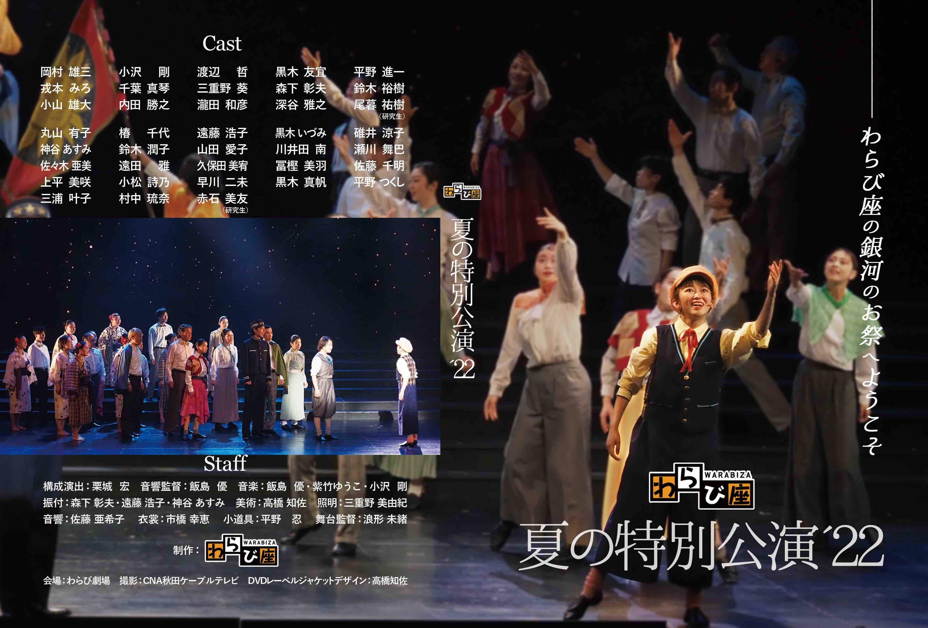 返礼品コースの「歌舞ステージオンライン配信」にて配信させて頂きました「わらび座 夏の特別公演‛22」ですが、「配信終了後も見る方法がありませんか?」、「別のコースで申し込んだのですが見る方法ありませんか?」といったお声が多数寄せられました。つきましてはお礼の気持ちを込め、ご要望にお応えして「わらび座 夏の特別公演‛22」舞台映像をDVDとして販売させて頂くこととなりました。71年目のわらび座総出演の舞台となります、是非お買い求めくださいませ。わらび座 夏の特別公演‛22 DVD価格:4400円初回限定盤特典:オリジナルラバーバンド(シルク印刷・周囲202mm・幅15mm)販売先:温泉ゆぽぽ本館売店わらび座・あきた芸術村公式オンラインショップhttps://www.estore-warabi.com/SHOP/tokubetsu22_dvd.html※新規会員登録でポイントプレゼント&ポイント2倍キャンペーン中!収録内容:– Musical Number –『銀河鉄道の夜』より「ようこそ銀河鉄道へ」「銀河鉄道の夜のテーマ・序曲」『アテルイ』より「日高見わがまほろば」『北前ザンブリコ』より「超えていくのだ」 ほか– Warabiza Traditional Arts –沖揚げ音頭(北海道)ハイヤ節(熊本県)樽太鼓(新潟県)月ぬ美しゃ(沖縄県)盆舞(青森県)大館囃子(秋田県)ほか