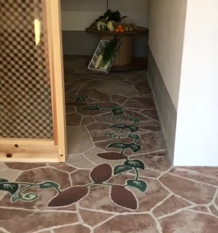 床には(株)KENSIN様にローラーストーンという技術でさつまいも描いてもらいました!