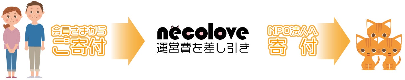 具体的には、婚活サイト「ねこらぶ」の会員さまからいただいたご寄付(任意)より運営費(3,000円)を差し引き、残余分をNPO法人の保護猫団体に寄付いたします。たとえば、5,000円ご寄付いただいた場合には5,000円-3,000円=2,000円を寄付させていただくという形です。