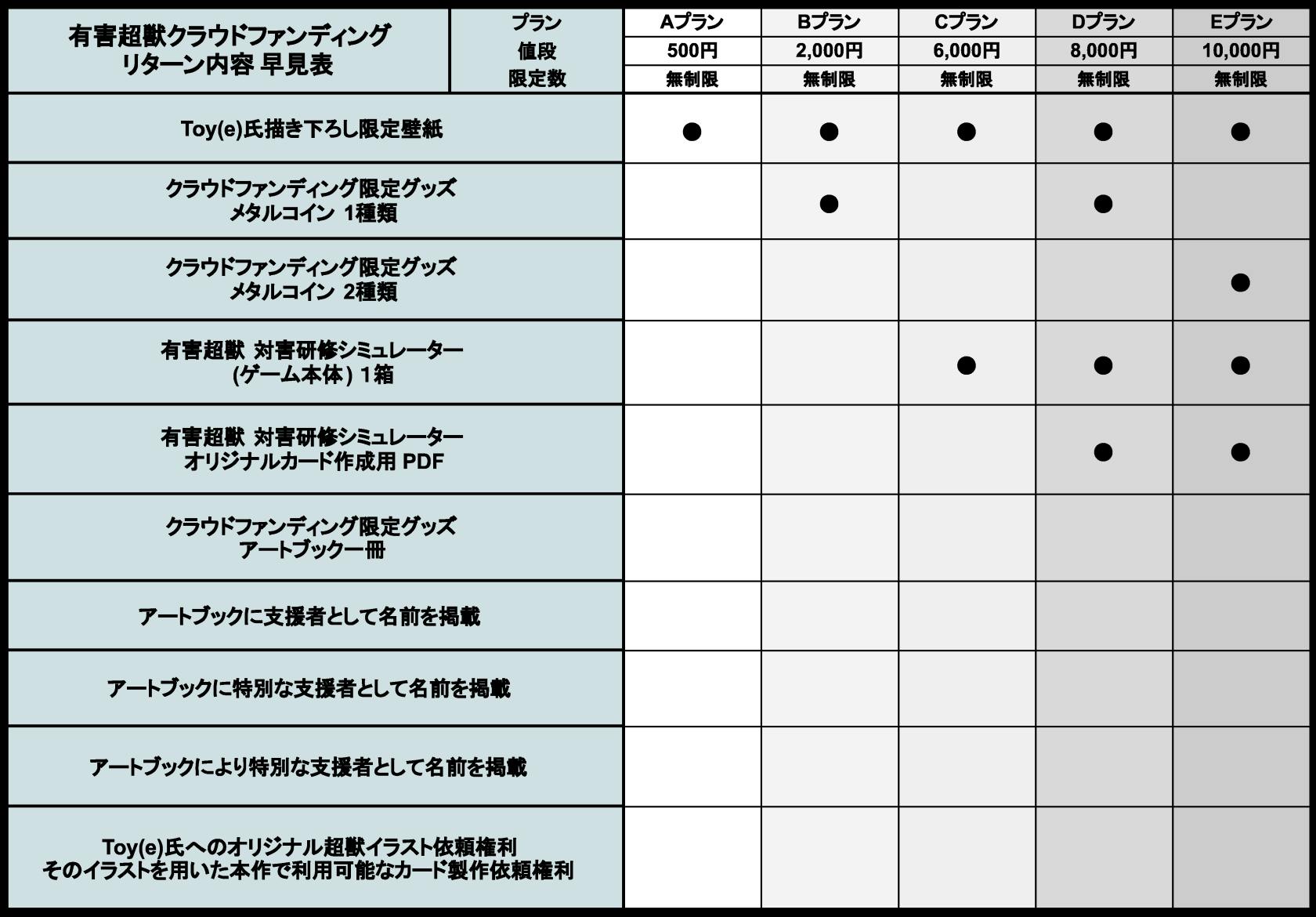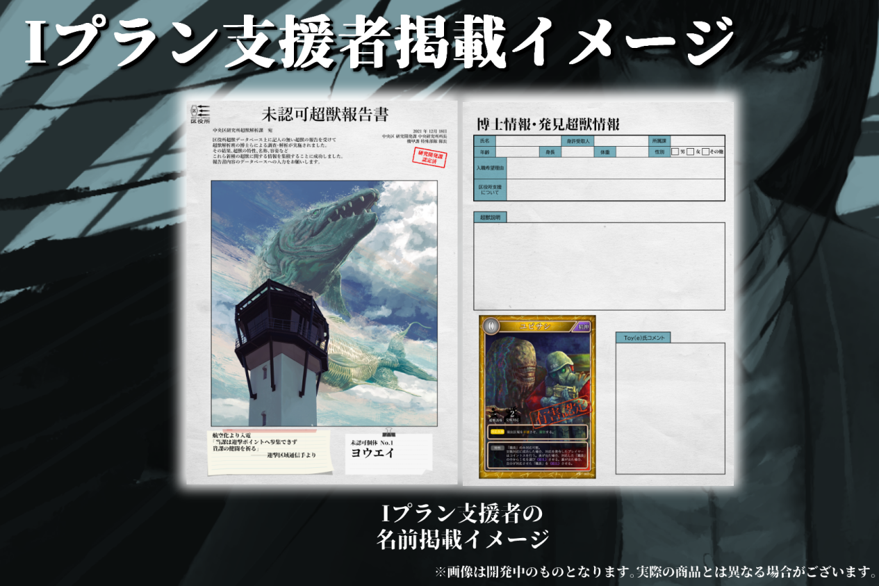 500万達成により人類側のカードを多数描き下ろしていただき、それ以降は10万円達成毎にまだ見ぬ新たな超獣を1体ずつ追加いたします。もちろん新規の超獣はToy(e)氏の描き下ろしとなります。