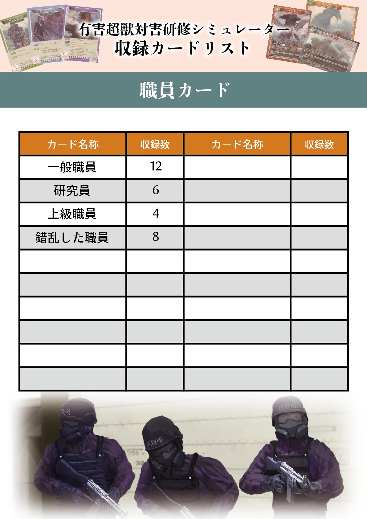 本シミュレーター内に含まれるコンポーネントのうち、各カードの枚数について記載したリストを用意させていただきました。