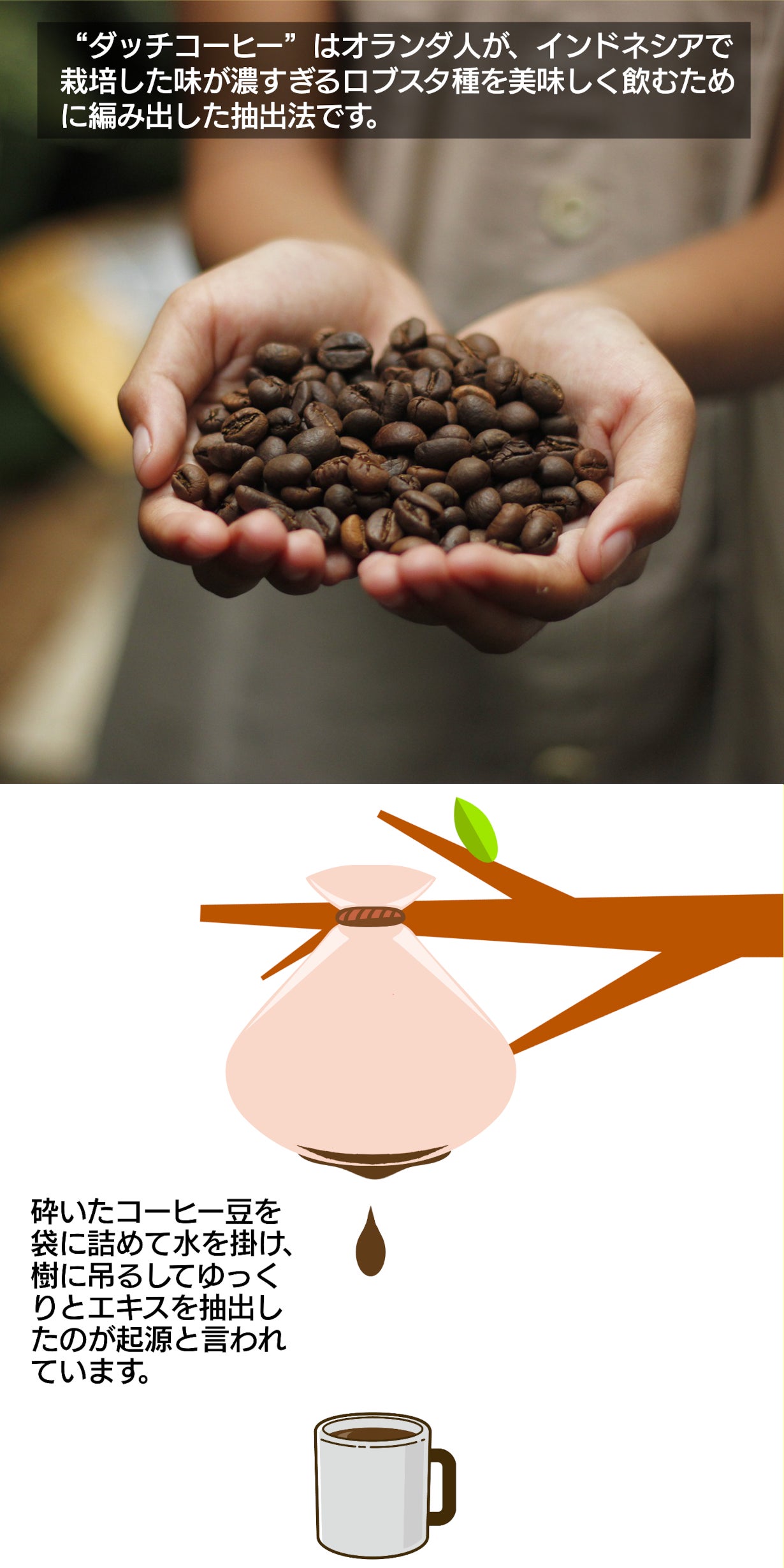 コクはあるが浅煎りでは酸味が、深入りでは苦みが強い「ロブスタ種」を美味しく頂くため、豆を入れた袋を樹に吊るし、水をかけてゆっくりと成分を抽出したのが始まりと言われています。