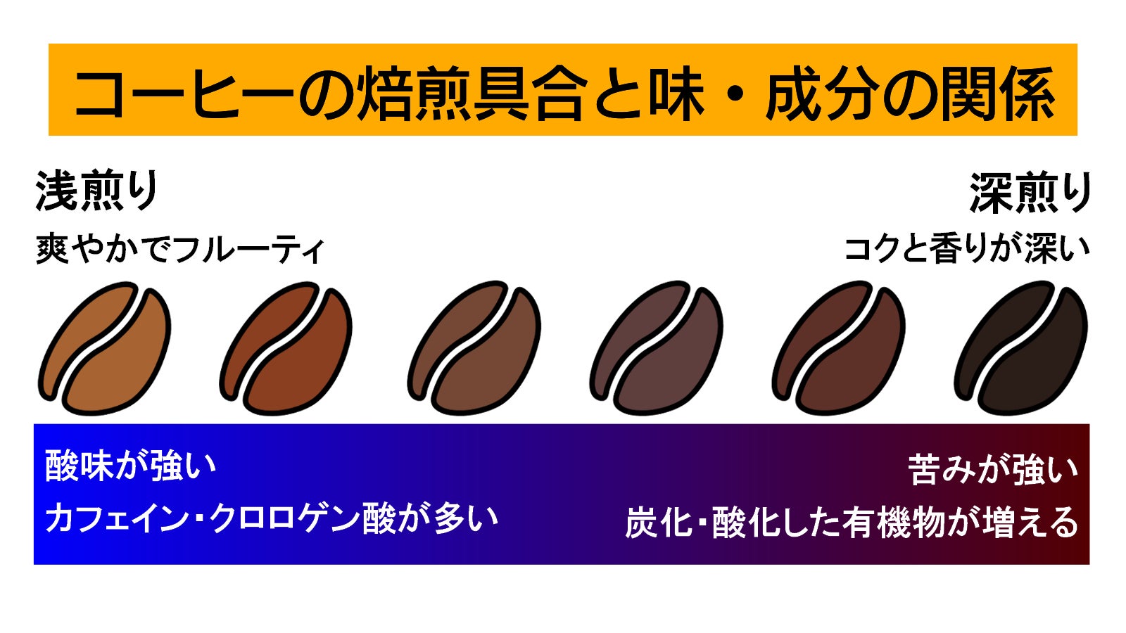 同時にコーヒーは酸味や苦みの原因となるクロロゲン酸やキナ酸、カフェインなども多く含み、浅煎りでは酸味やカフェインが、深煎りでは豆の成分が酸化・炭化して苦味が強く出ます。