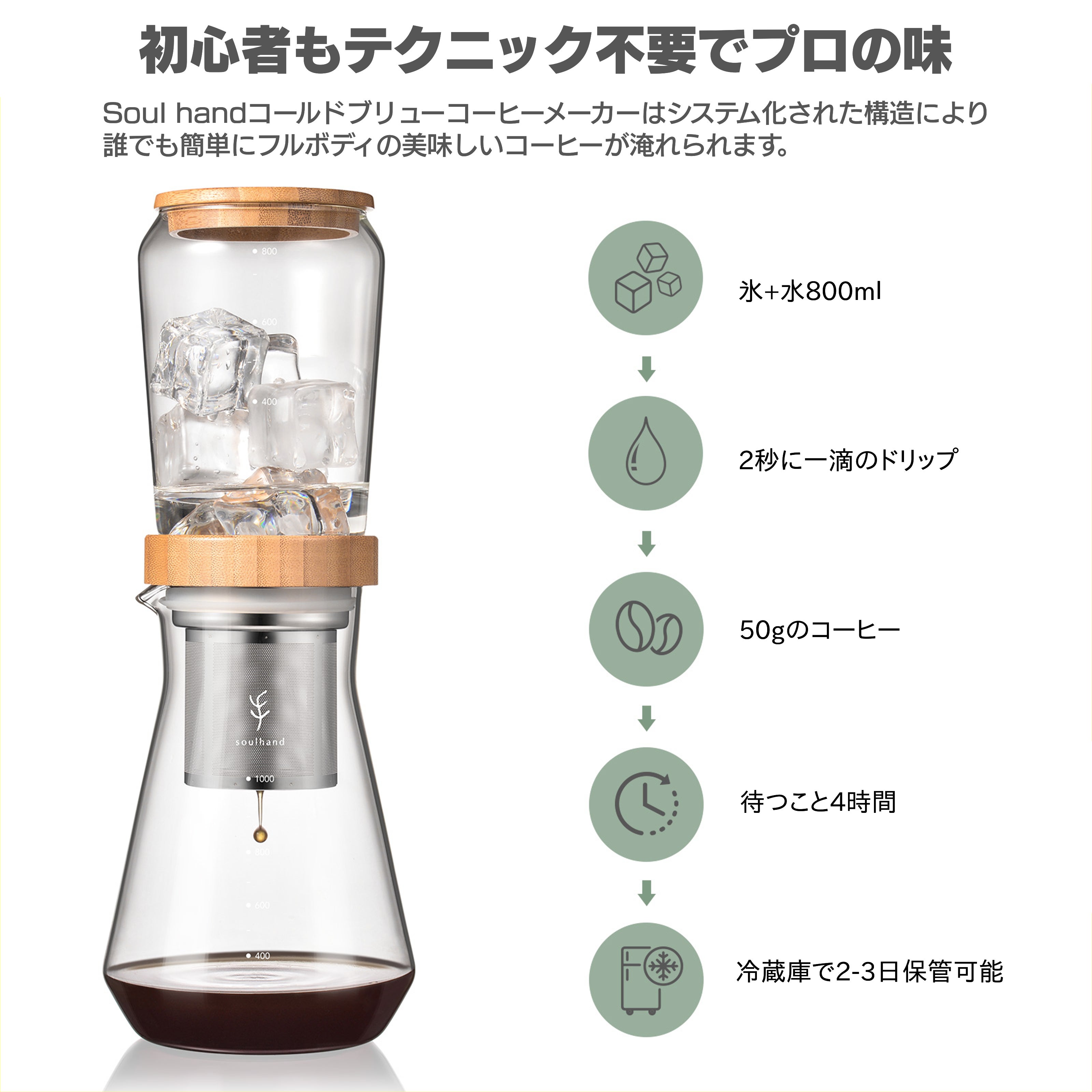 ハンドドリップで美味しいコーヒーを諦めてしまったコーヒー初心者も、Soul handコールドブリューコーヒーメーカーならプロ顔負けの美味しいコーヒーが超お手軽に楽しめます。