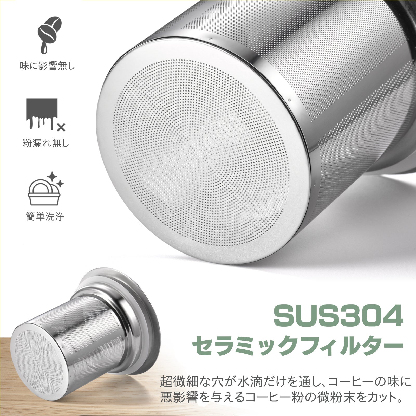 Soul handコールドブリューコーヒーメーカーは繰り返し使え、耐食性や耐薬性に優れた304ステンレス製のフィルターを採用しています。