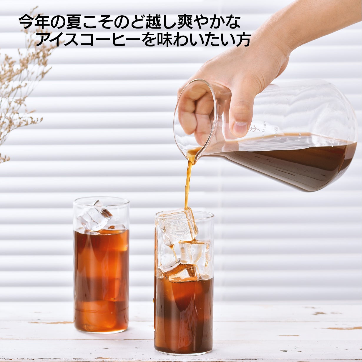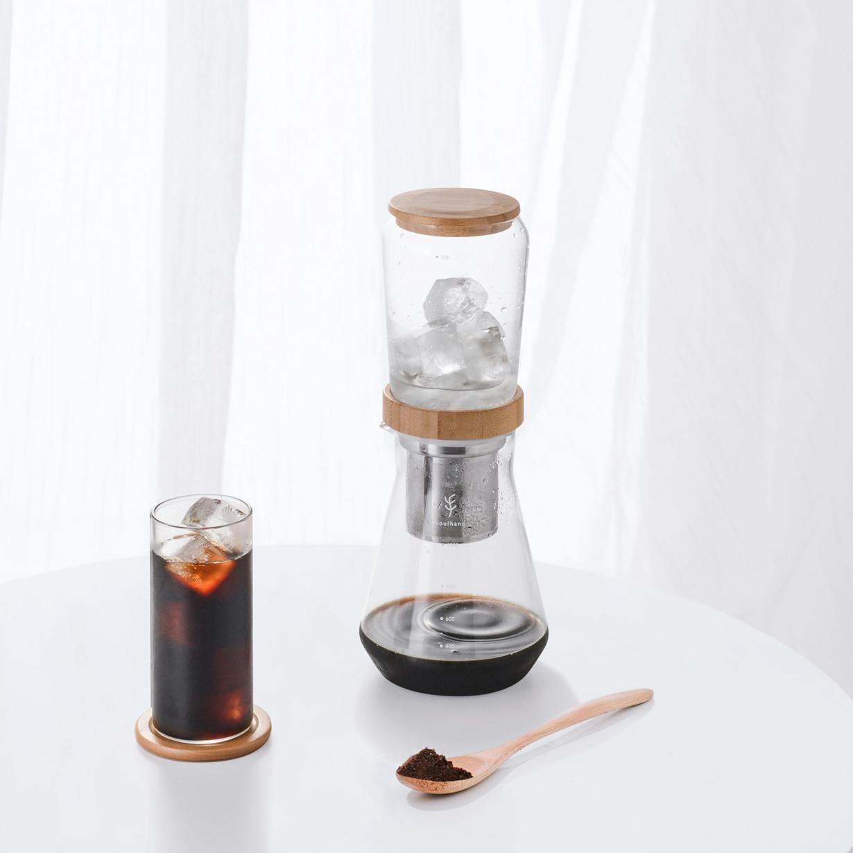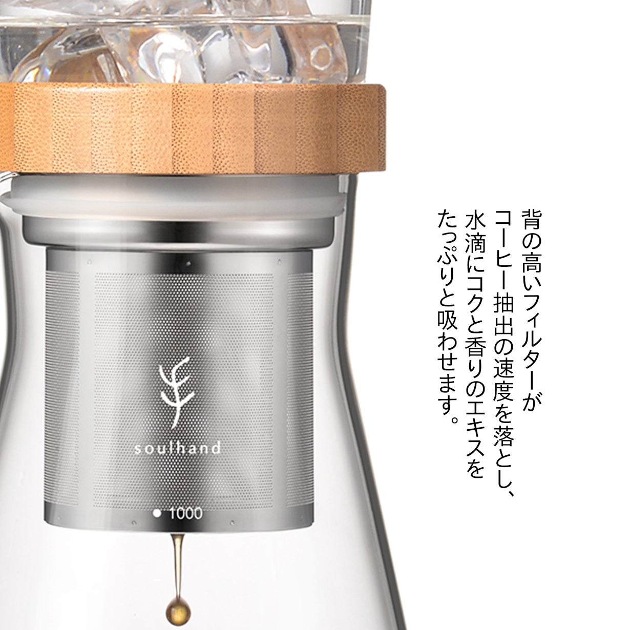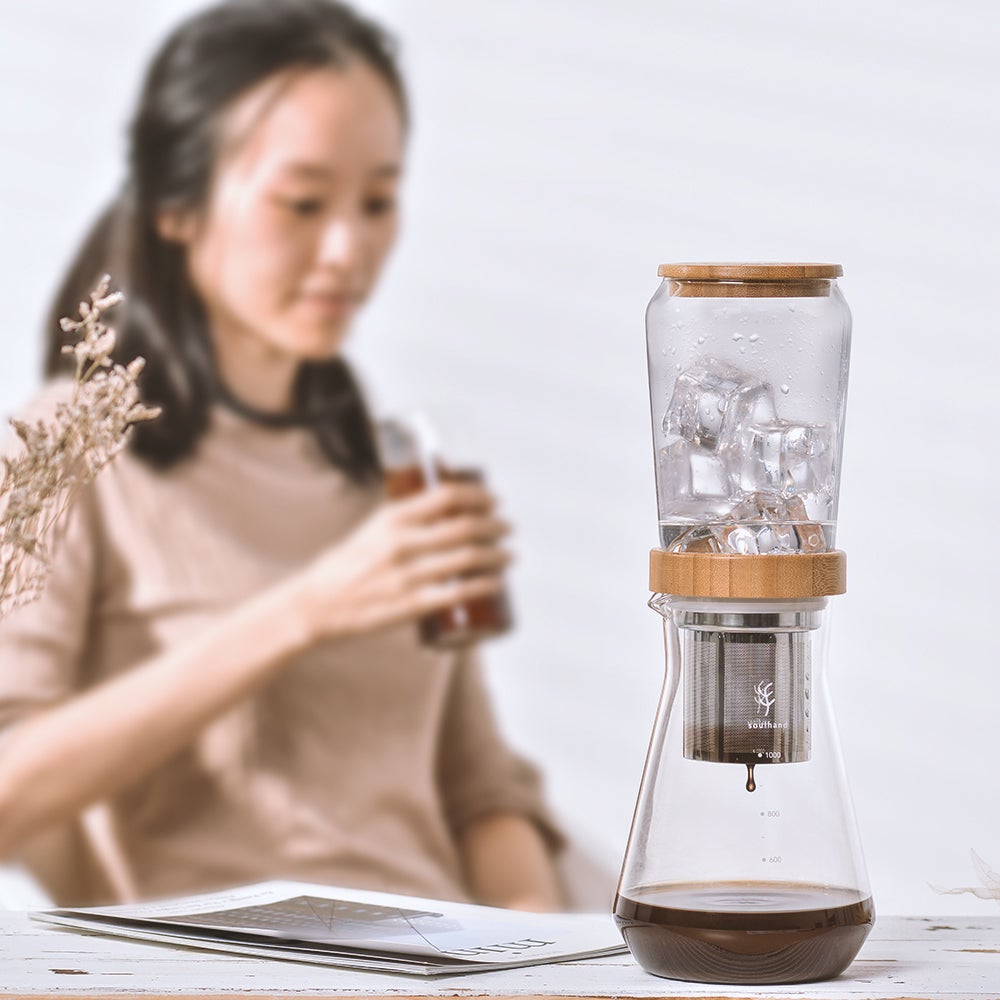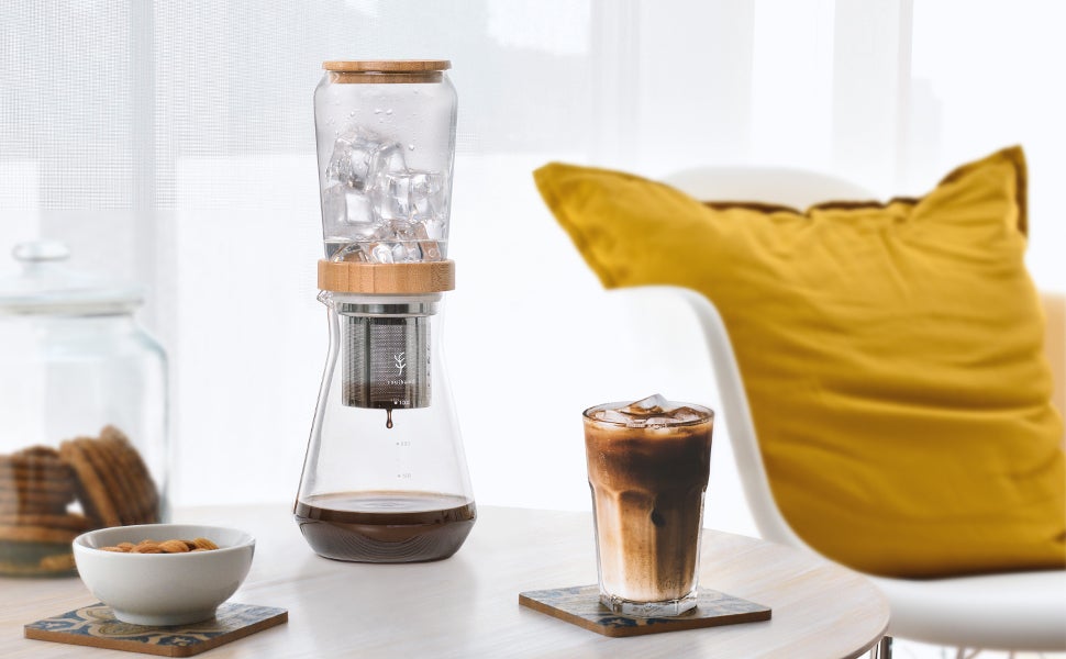 透明なガラスの容器にバンブー(竹)製の蓋を配したナチュラルな組み合わせは爽やかで、氷を入れコーヒーが一滴一滴抽出されていく姿を見るだけでも楽しくなります。